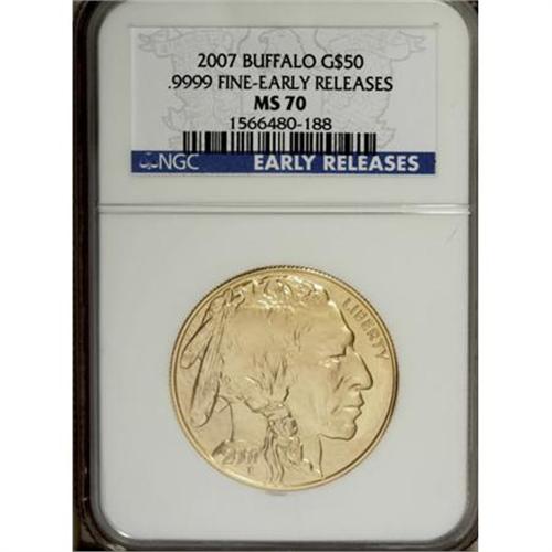 <B>2007 $50 One Ounce Gold Buffalo MS70 NGC.</B></I> .9999 Fine -Early Releases. NGC Census: (0/0). PCGS Population (843/0). (#149122)<BR><BR><b>Shipping:</b> Coins & Currency (<a target="_blank" href="http://www.heritageauctions.com/common/shipping.php">view shipping information</a>)