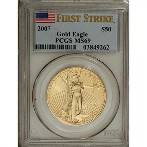 <B>2007 $50 First Strike One-Ounce Gold Eagle MS69 PCGS.</B></I> PCGS Population (2286/115). NGC Census: (0/0). (#146921)<BR><BR><b>Shipping:</b> Coins & Currency (<a target="_blank" href="http://www.heritageauctions.com/common/shipping.php">view shipping information</a>)