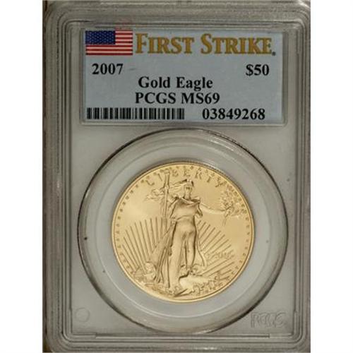 <B>2007 $50 First Strike One-Ounce Gold Eagle MS69 PCGS.</B></I> PCGS Population (2286/115). NGC Census: (0/0). (#146921)<BR><BR><b>Shipping:</b> Coins & Currency (<a target="_blank" href="http://www.heritageauctions.com/common/shipping.php">view shipping information</a>)