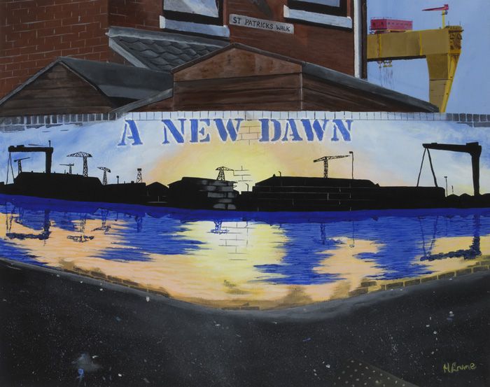 An framed oil on board painting by Mark Ervine (son of Progressive Unionist Party leader David Ervine) of his mural 'A New Dawn' on the Newtownards Road in Belfast and in the shadow of the Harland & Wolff cranes. Signed lower right and with Eakin Gallery label on reverse. Also with A Shout In The Street by Declan McGonagle which shows the mural on page 14.