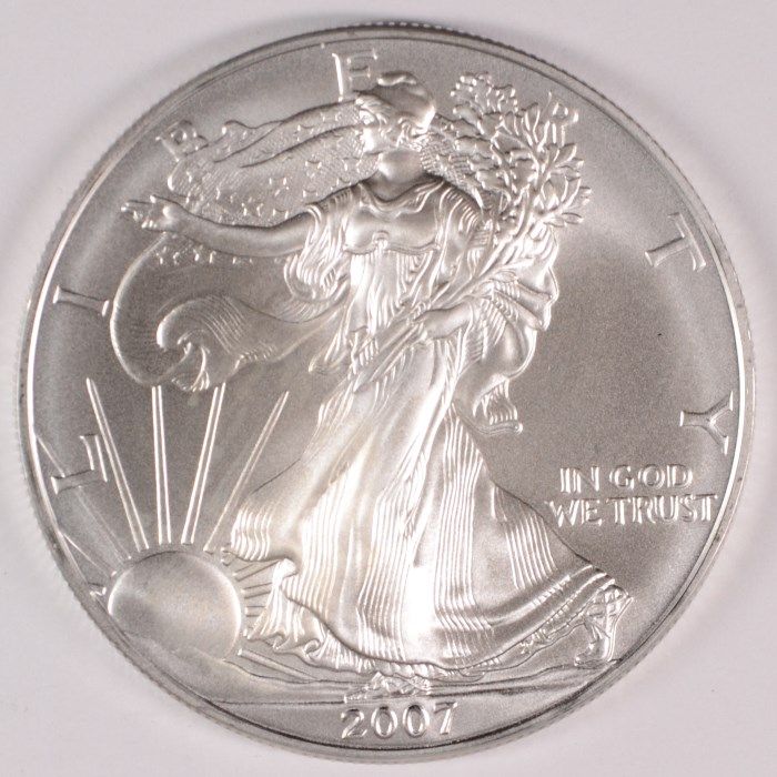 2007 AMERICAN SILVER EAGLE, GEM BU, RIGHT FROM THE MINT TUBE,