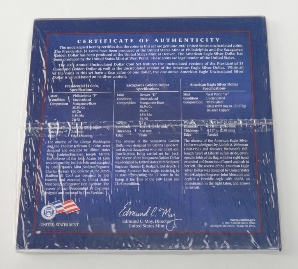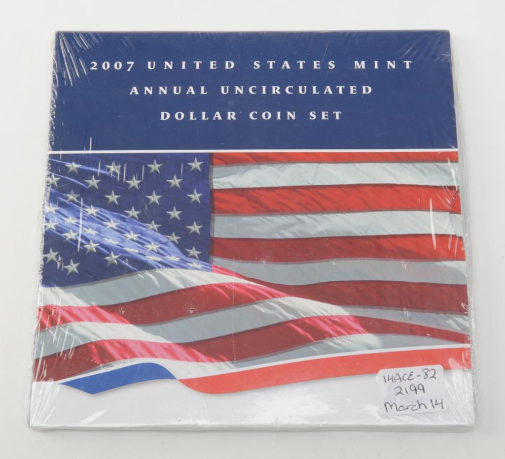 2007 Annual U.S. Mint Set with a Silver Eagle and 5 Presidential Dollars; still in sealed pack. Est.: $32-$64.