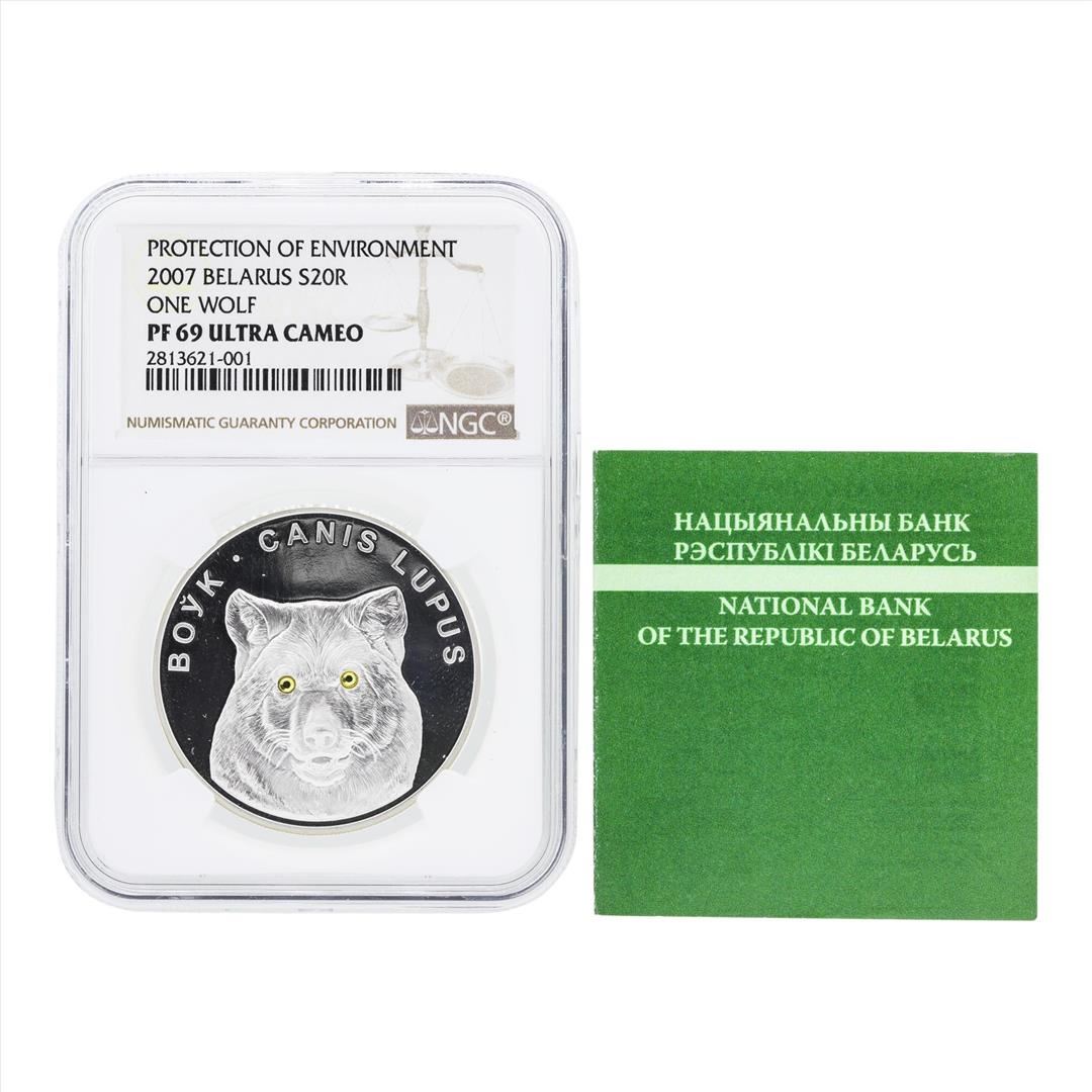 One 2007 Belarus 20 Roubles One Wolf Silver Coin NGC PF69 Ultra Cameo.