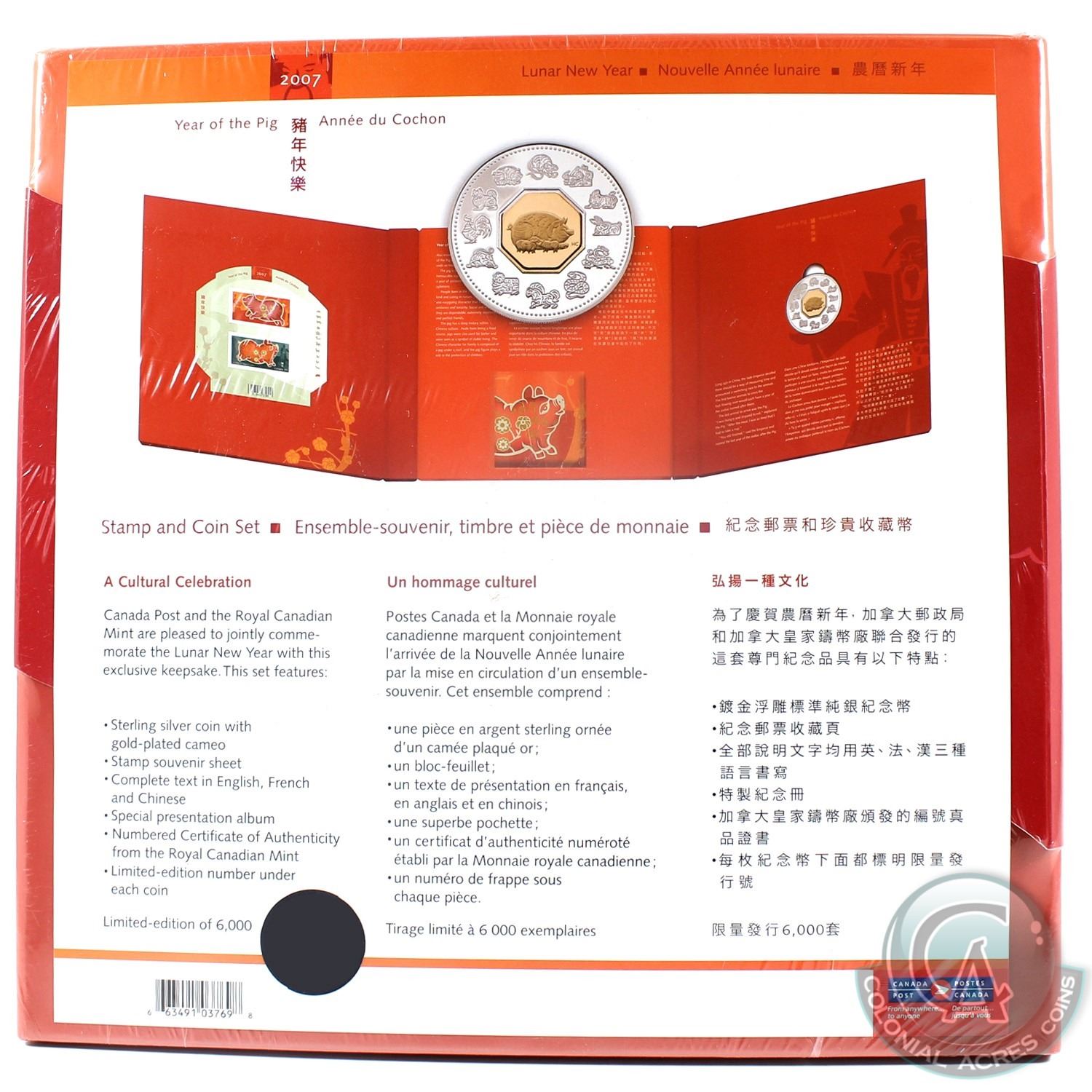 2007 Canada $15 Year of the Pig Sterling Silver and Gold Plated Cameo Coin and Stamp Set with all Original Packaging from the RCM and Canada Post. *still sealed*