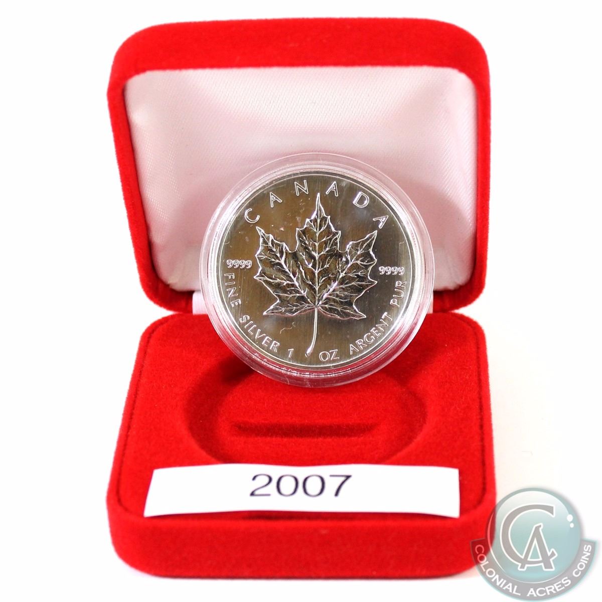 2007 Canada 1oz Fine Silver Maple Leaf (TAX Exempt). Coin comes encapsulated in a red presentation clamshell case. Please note coin contains faint spots.