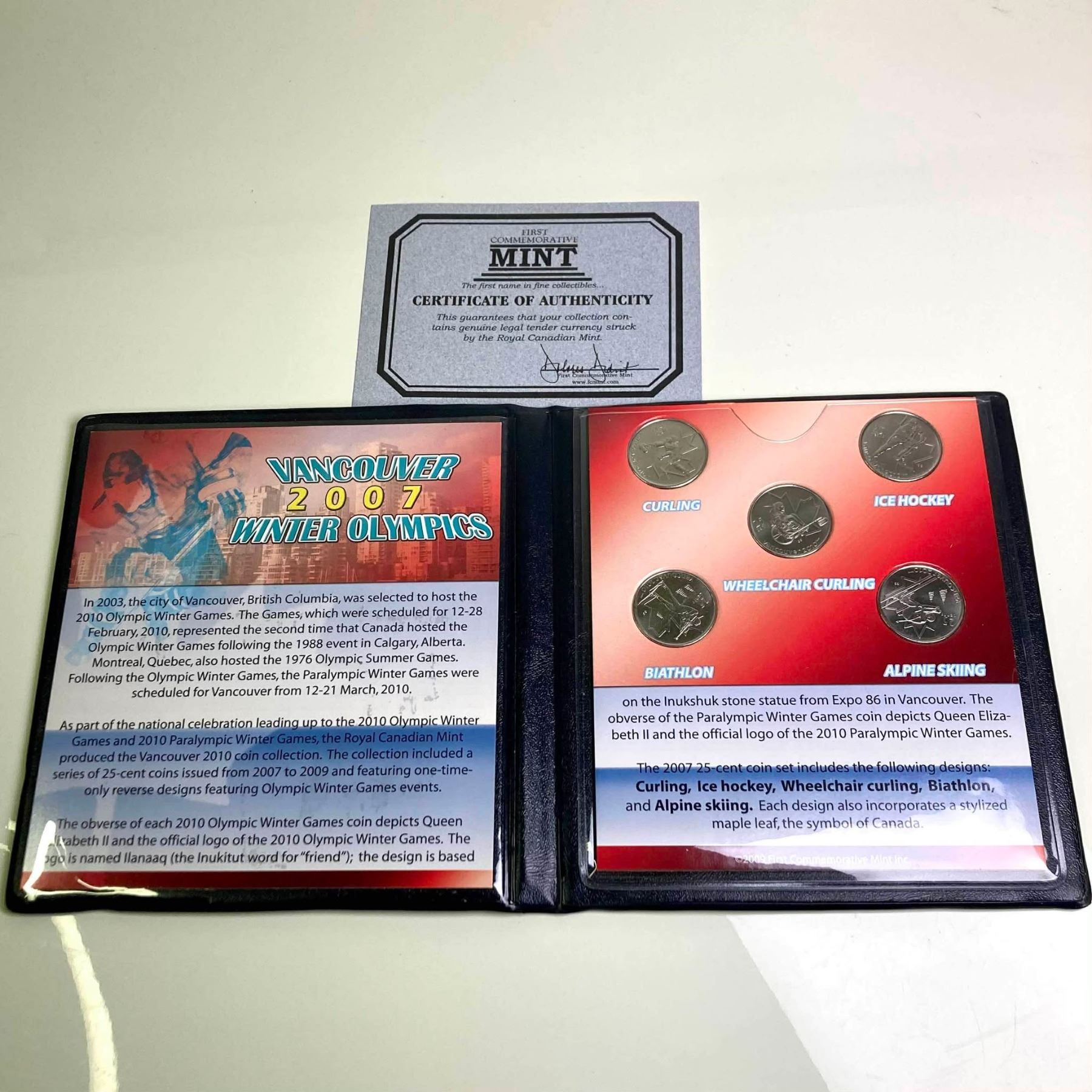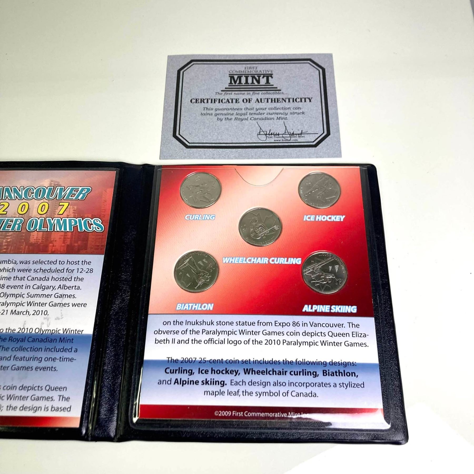 Vancouver Winter Olympics quarter set in special packaging by First Commemorative Mint. 5 coins.