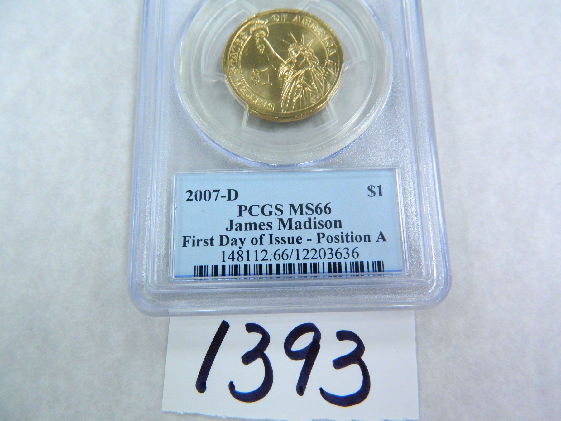 2007-D James Madison Dollar First Day of Issue, Position A, PCGS Graded MS66
