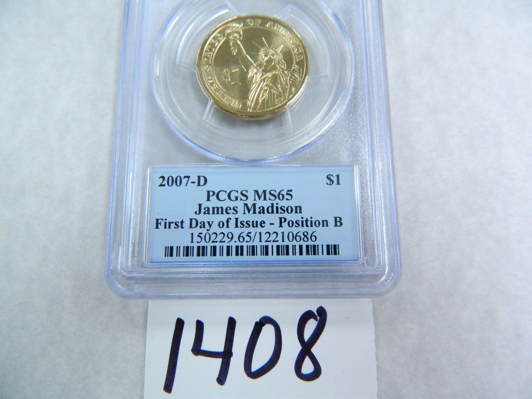 2007-D James Madison Dollar First Day of Issue, Position B, PCGS Graded MS65