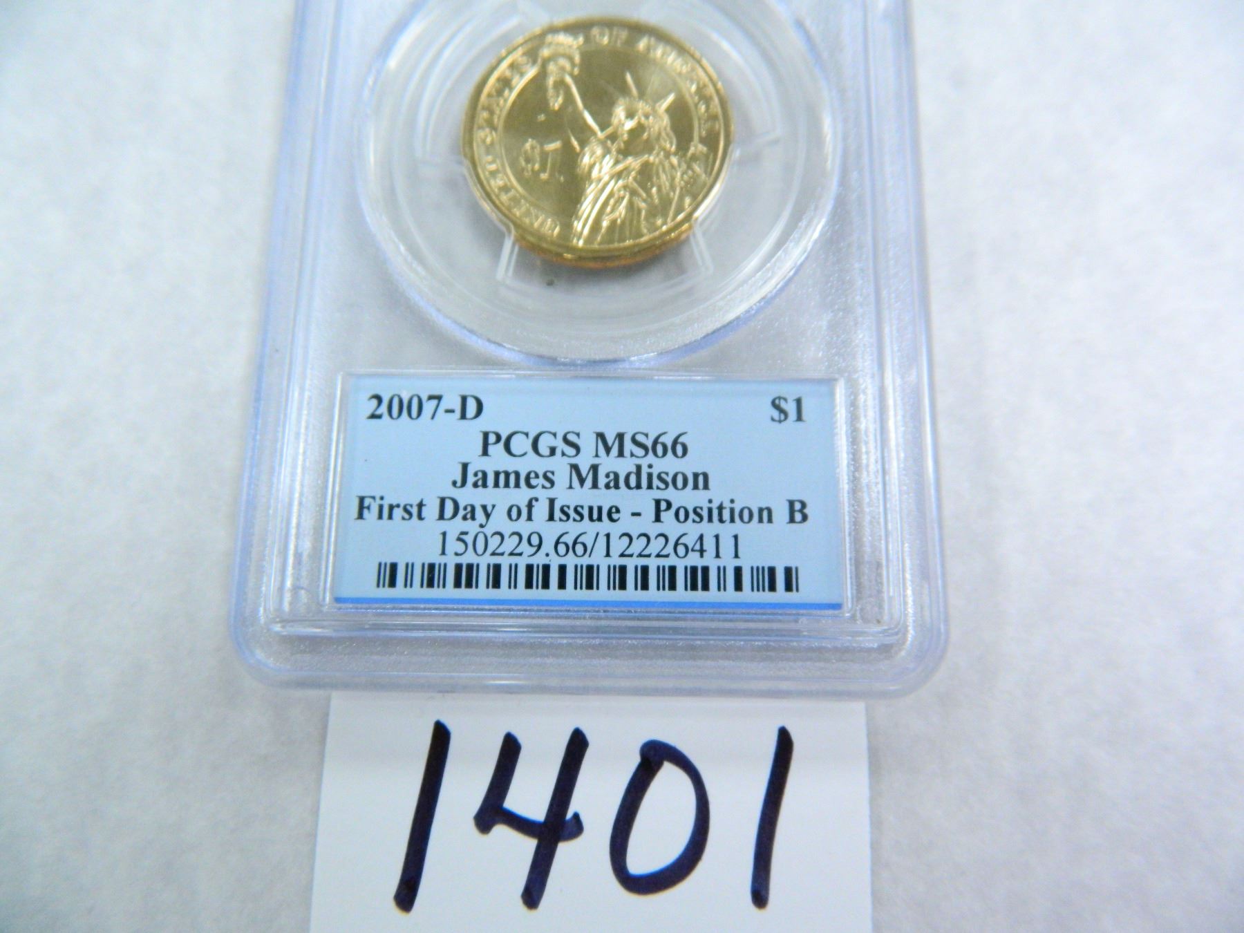 2007-D James Madison Dollar First Day of Issue, Position B, PCGS Graded MS66