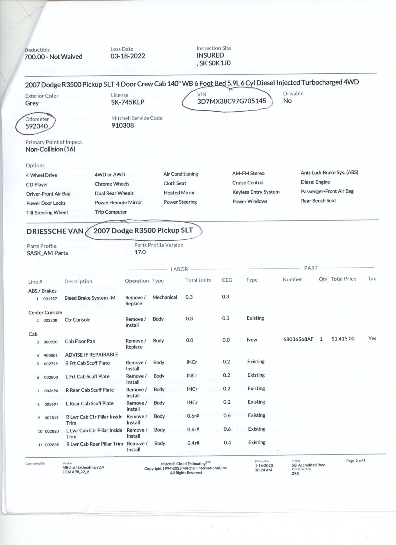 Milage: 592,340 km. THIS IS NOT COVERED BY INSURANCE - IS ESTIMATE ONLY. Other damage: Transfer case exploded and caused damage to floor and wiring harness, etc. NO TURBO ON TRUCK ENGINE. Call for more info.