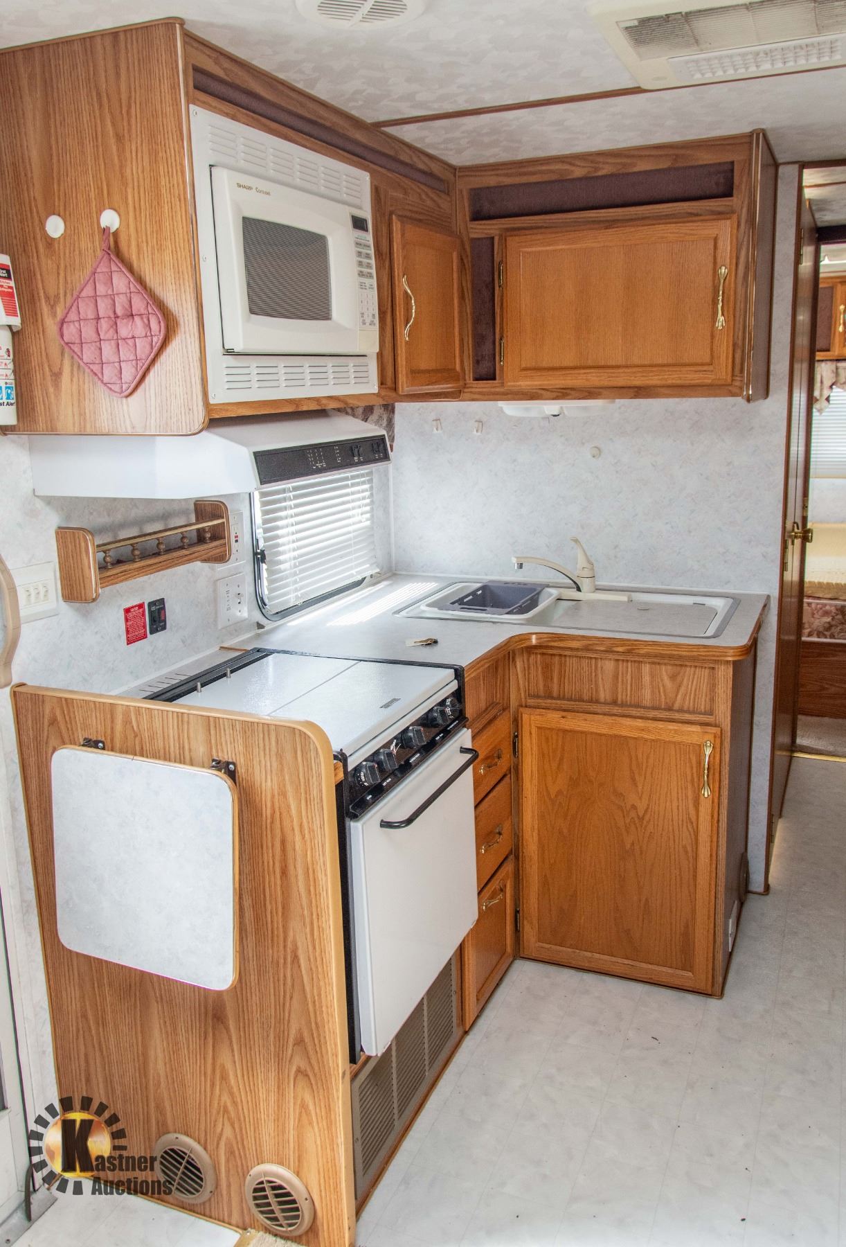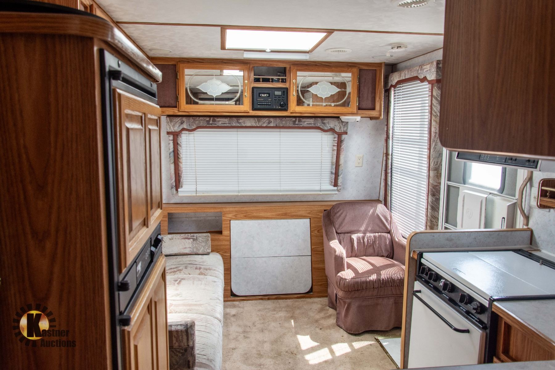 HOLIDAY TRAILER FEATURES NORMAL ACTIVE STATUS, FRIDGE AND FREEZER, DOUBLE SINK, SHARP MICROWAVE, 3 BURNER STOVE, OVEN, BATHTUB AND SHOWER, TOILET, SPACE FOR QUEEN SIZE BED IN BEDROOM, AIR CONDITIONING, SOLAR PANEL CHARGING SYSTEM, COUCH PULLS OUT TO A DOUBLE BED.