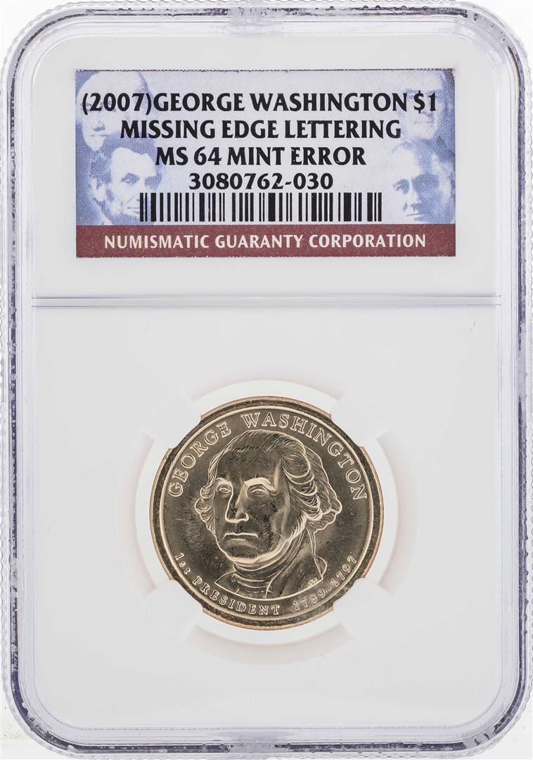 One 2007 George Washington $1 ERROR Missing Edge Lettering NGC MS64. NGC Certified.