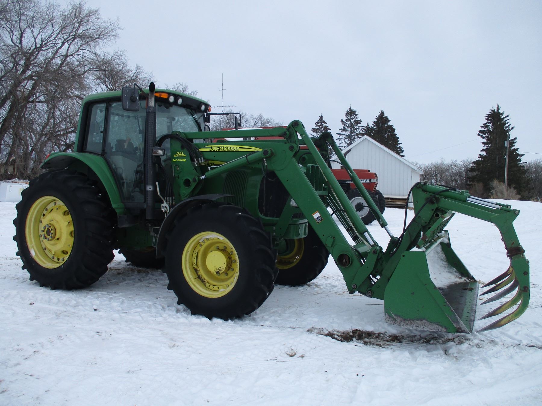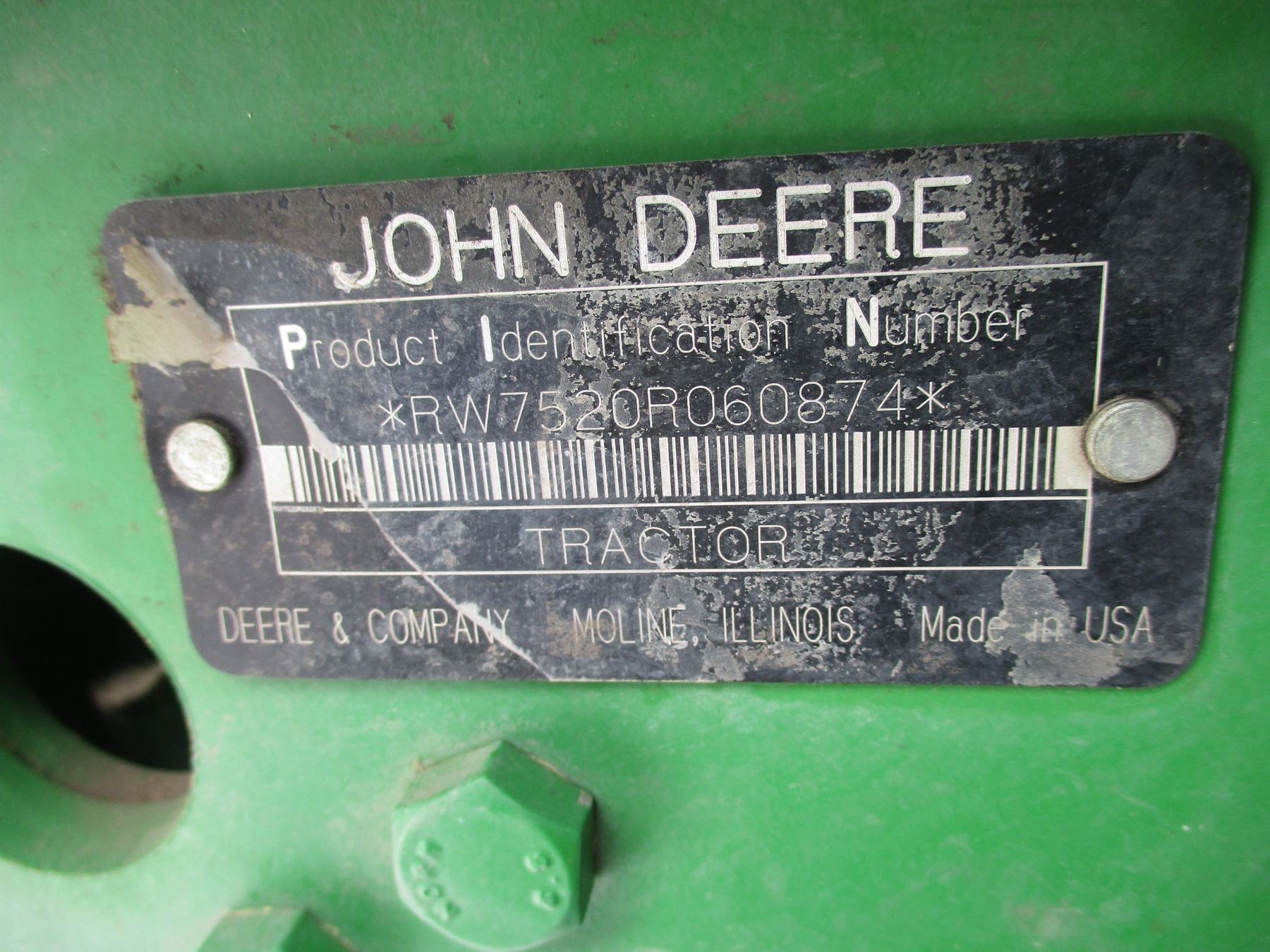 2007 John Deere 7520 MFWD w/ 741 FEL self levelling quick attach loader, 3 pt. hitch, 40 kph 20-speed power quad transmission w/ left hand reverser. (RW7520RO60874) 540 - 1000 PTO. 6,689 hours