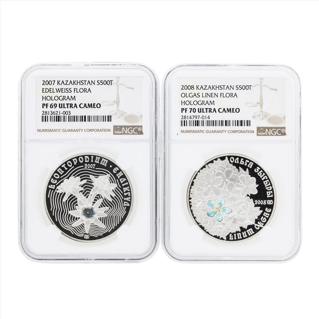 One 2007 Kazakhstan 500 Tenge Edel Weiss Flora Hologram Silver Coin NGC PF69 Ultra Cameo.