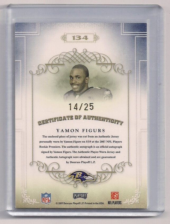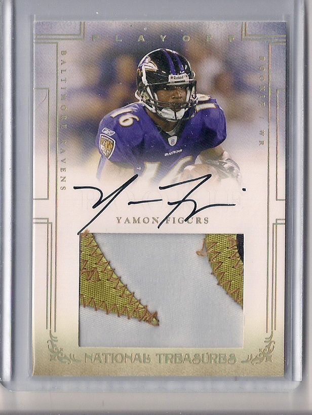 2007 National Treasures Yamon Figurs Autographed Patch Rookie Card #134. This Real Rookie Card is signed in Black Sharpee on the card, features an oversized Three-Color White, Gold, and Purple Patch, and is serial numbered 14/25! Card is Near Mint.