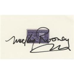 <B>Mickey Rooney Autograph.</B></I> A 3" x 5" card, with a three-cent commemorative postage stamp affixed, signed by Mic...
