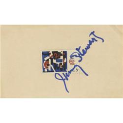 <B>Jimmy Stewart Autograph.</B></I> A 3" x 5" card, with a five-cent commemorative postage stamp affixed, signed by the ...