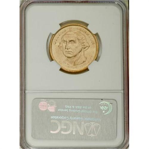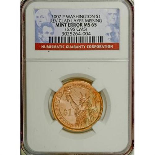 <B>2007-P $1 Washington Dollar--Reverse Clad Layer Missing--MS65 NGC.</B></I> The reverse is missing most of its clad layer, with the bright copper appearance from the core in full brilliance. Remnants of the clad layer appear to remain over a small portion of the reverse, with its characteristic light yellow color.<BR><BR><b>Shipping:</b> Coins & Currency (<a target="_blank" href="http://www.heritageauctions.com/common/shipping.php">view shipping information</a>)