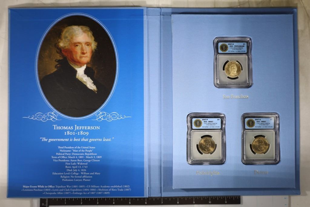 ICG IN NICE LARGE FOLIO AS SHOWN. THE COINS ARE THOMAS JEFFERSON. 2007-S ICG PR70 DCAM, 2007-P ICG MS67 AND 2007-D ICG MS67
