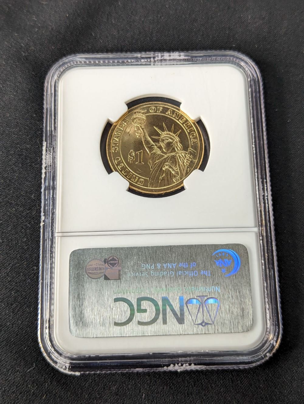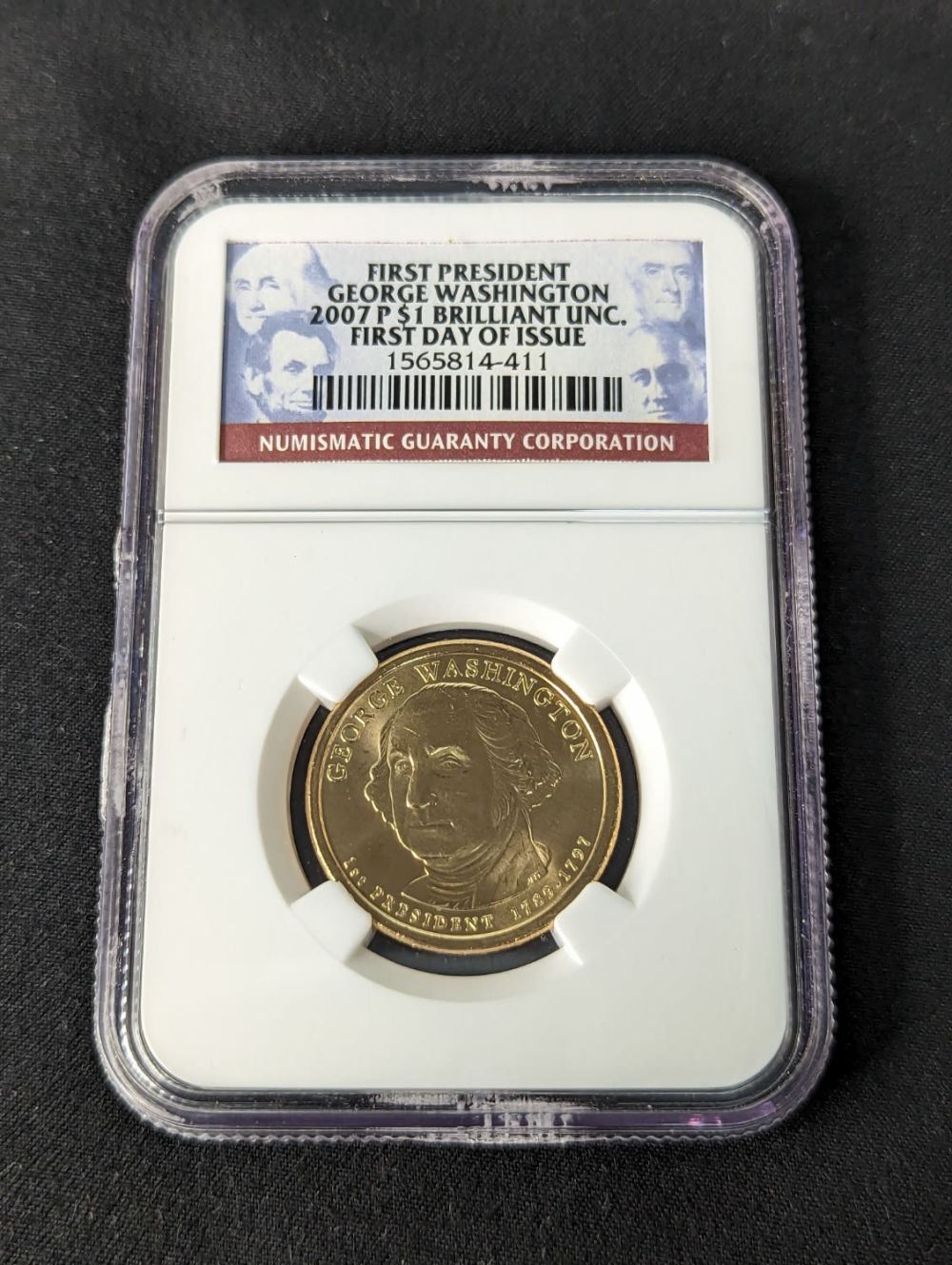 A 2007 P George Washington Golden Dollar First day of Issue NGC Graded Brilliant Uncirculated. A Beautiful Coin