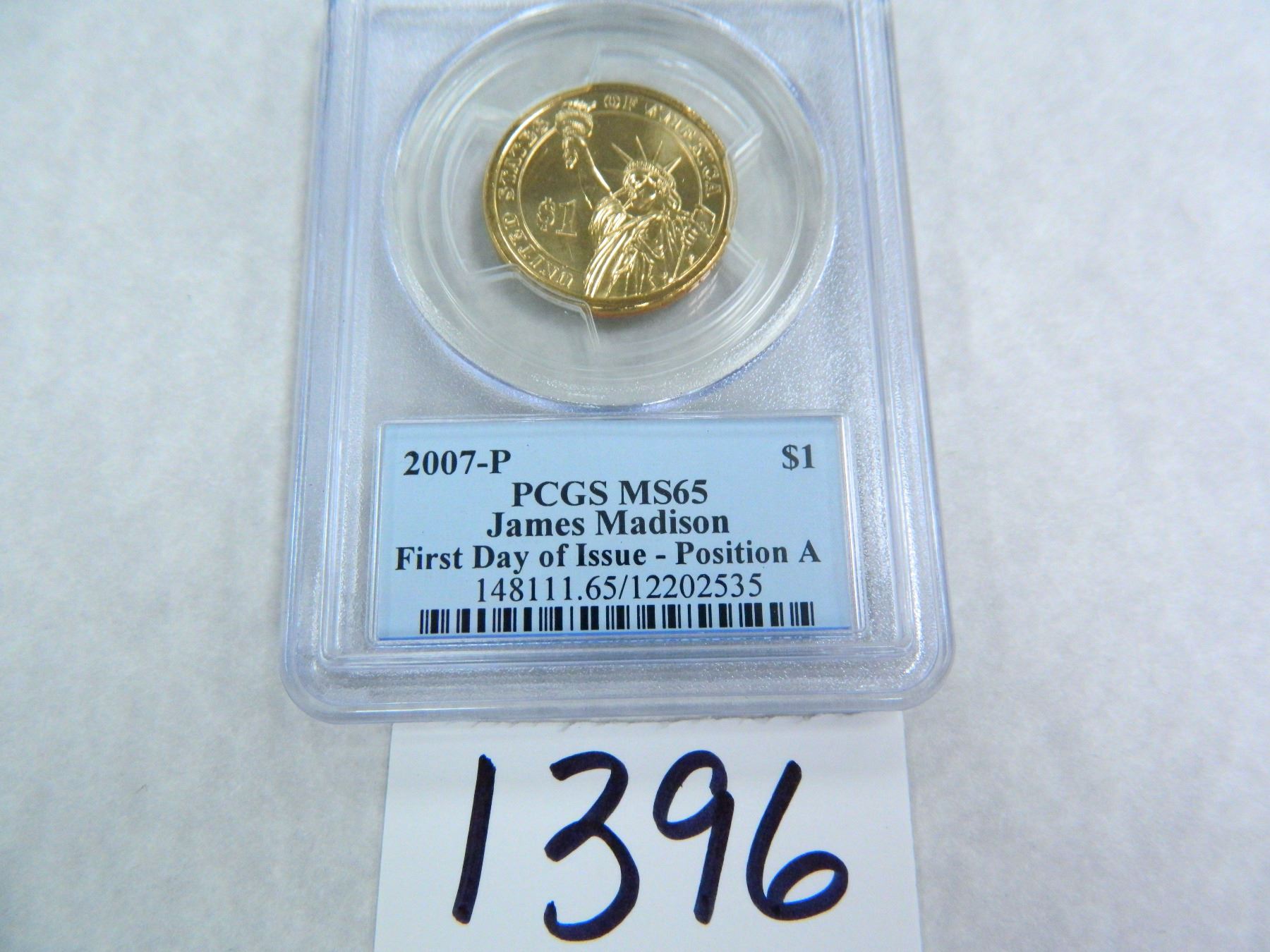 2007-P James Madison Dollar First Day of Issue, Position A, PCGS Graded MS65