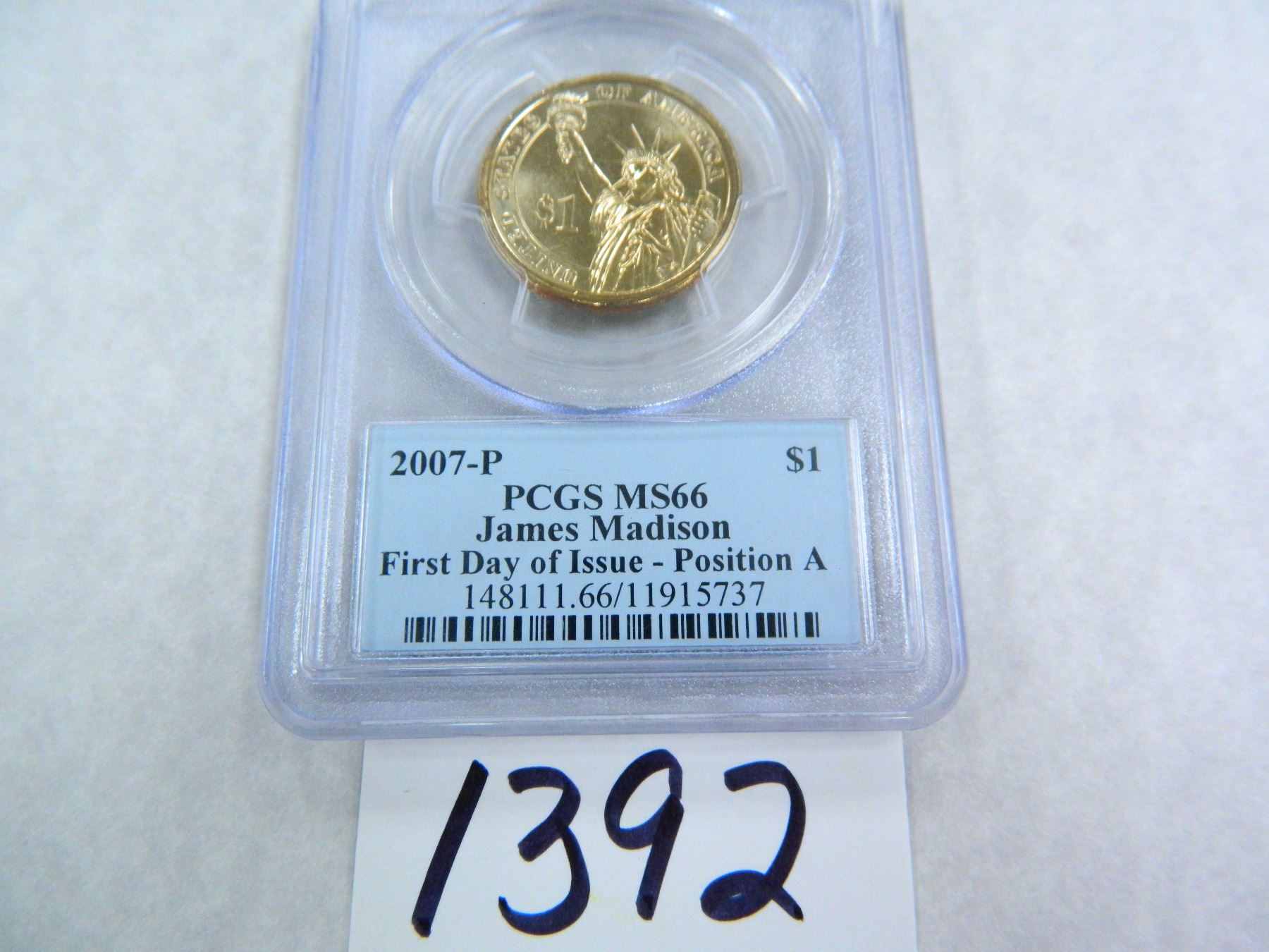 2007-P James Madison Dollar First Day of Issue, Position A, PCGS Graded MS66