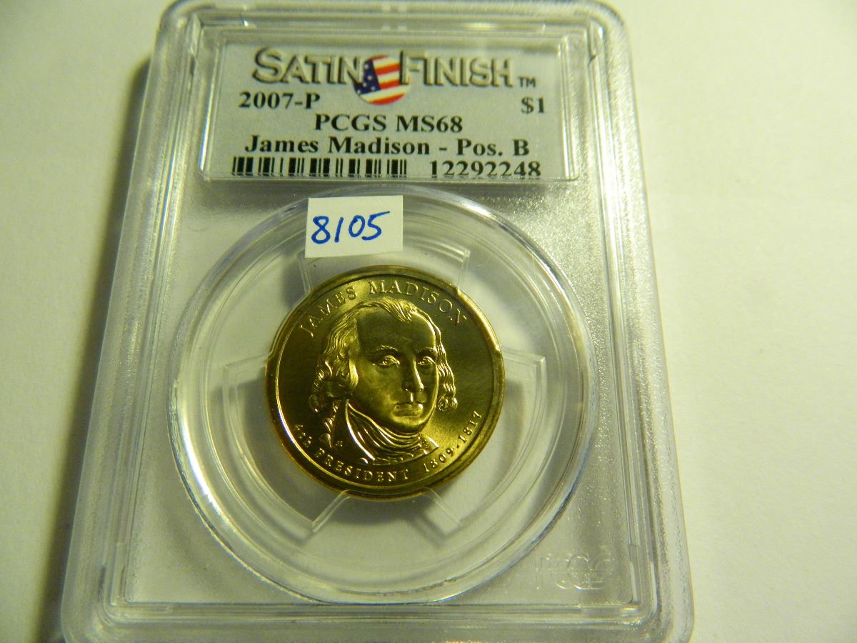 2007-P James Madison Dollar - Position B, SATIN FINISH. PCGS Graded MS68