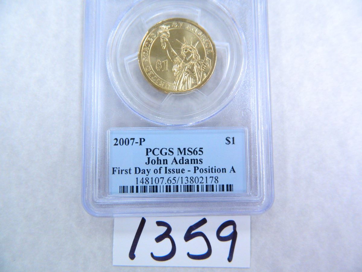 2007-P John Adams Dollar, FIRST DAY OF ISSUE, Position A, PCGS Graded MS65