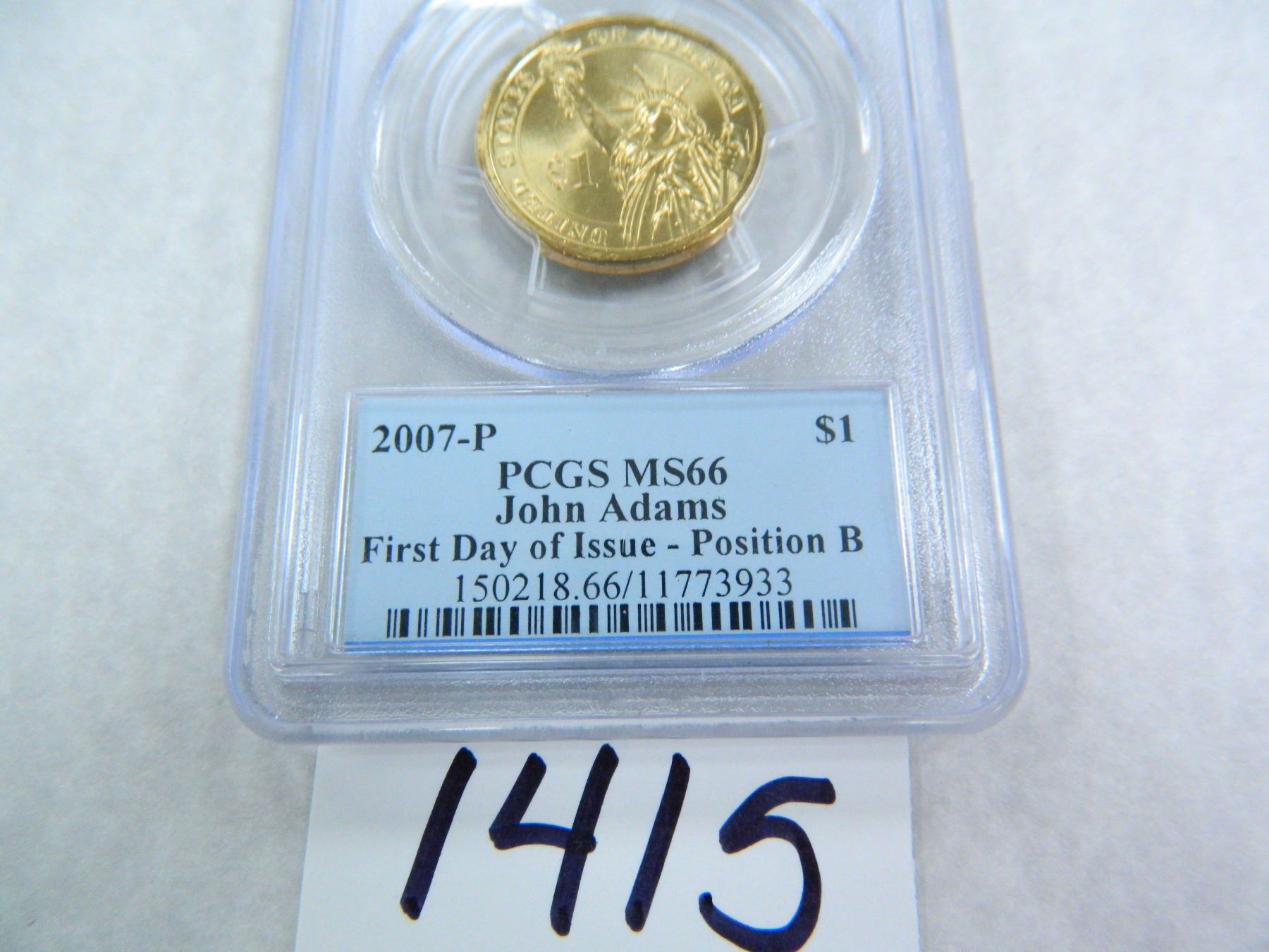 2007-P John Adams Dollar, PCGS Graded MS66, First Day of Issue - Position B