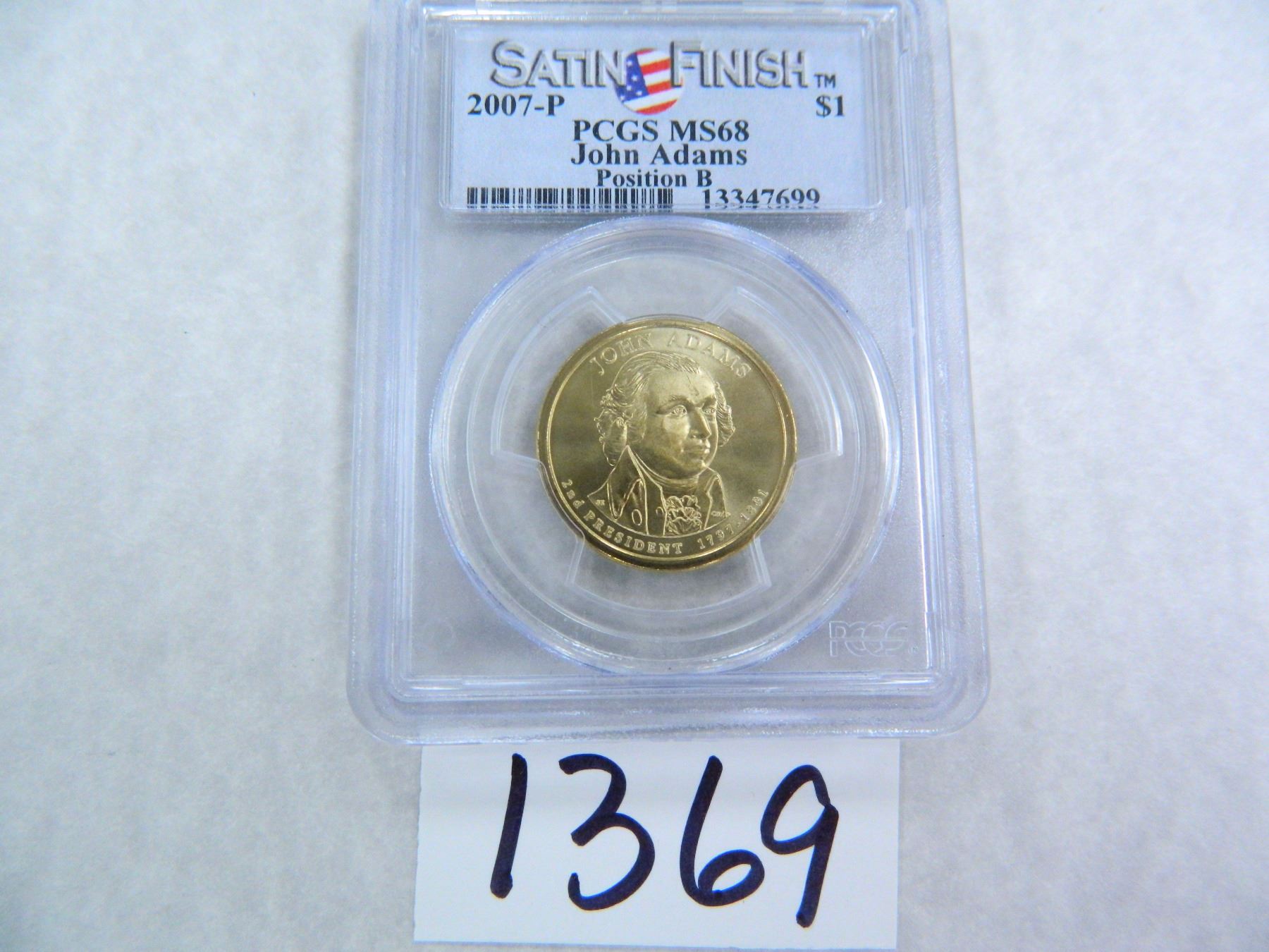 2007-P John Adams Dollar, SATIN FINISH, Position B, PCGS Graded MS68