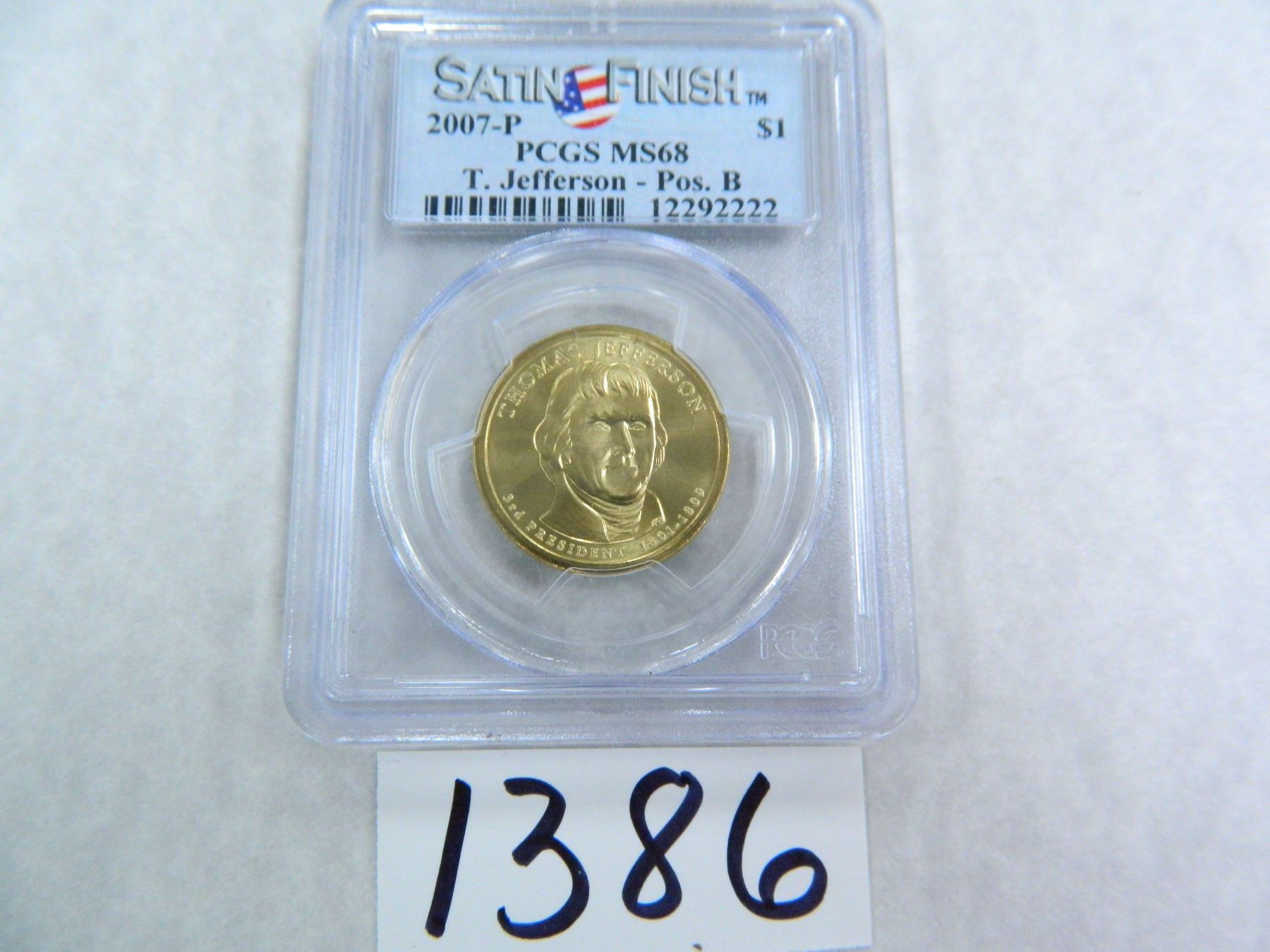 2007-P Thomas Jefferson Dollar, SATIN FINISH, Position B, PCGS Graded MS68