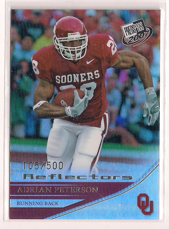 2007 Press Pass Reflectors Adrian Peterson Parallel Rookie Card #11. This Parallel RC is serial numbered 105/500 and is Near Mint.