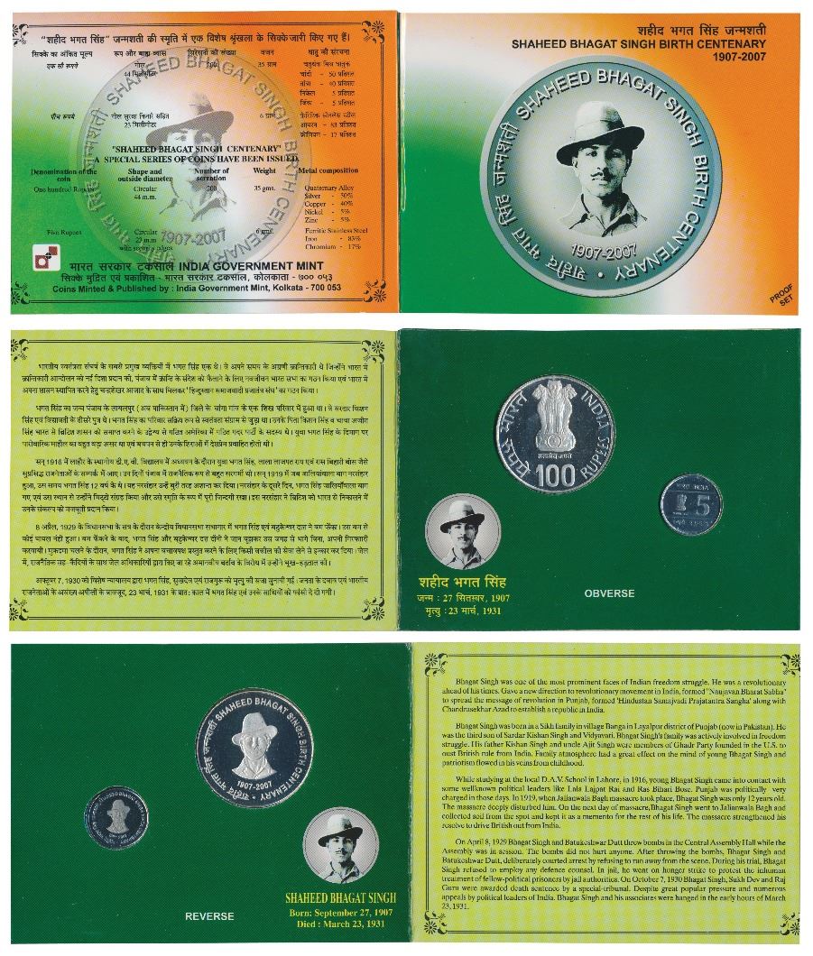 2007 Proof Set, Shaheed Bhagat Singh Birth Centenary, set of 2, Rupees 5 and 100. In immaculate condition, within original packaging. (2)