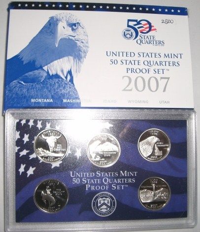 2007-S 50 STATE QUARTERS PROOF SET ISSUE PRICE WAS $13.95 HAS *MT/WA/ID/WY/UT* QUARTERS IN SET. SET COMES IN ORIGINAL MINT PACKAGE!! QUARTER PROOF SET CAME OUT OF SAFE!! ***Coin, Currency & All Items Listed in this auction - Grades, Conditions and Values are not Safe Deposit Coins LLC Responsibilty. Grades, Condition and Values are determined by Consigner(s) & Buyers