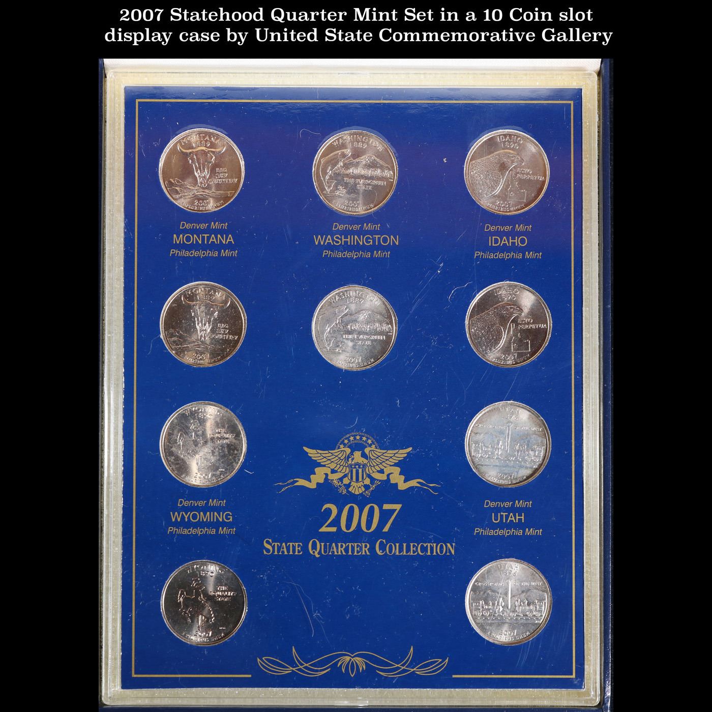 2007 Statehood Quarter Mint Set in a 10 Coin slot display case by United State Commemorative Gallery.. This set contain two of each 2007 Statehood quarters honoring Montana (P,D), Washington (P,P), Idaho (P,D), Wyoming (P,D), Utah (P,P). All 10 America the Beautiful™ State Quarters in a prestigious museum-quality Presidential Display Case by the United State Commemorative Gallery Company, is accented with gold embossing and is perfect for displaying each historic year of the Statehood Quarter Dollar Program.