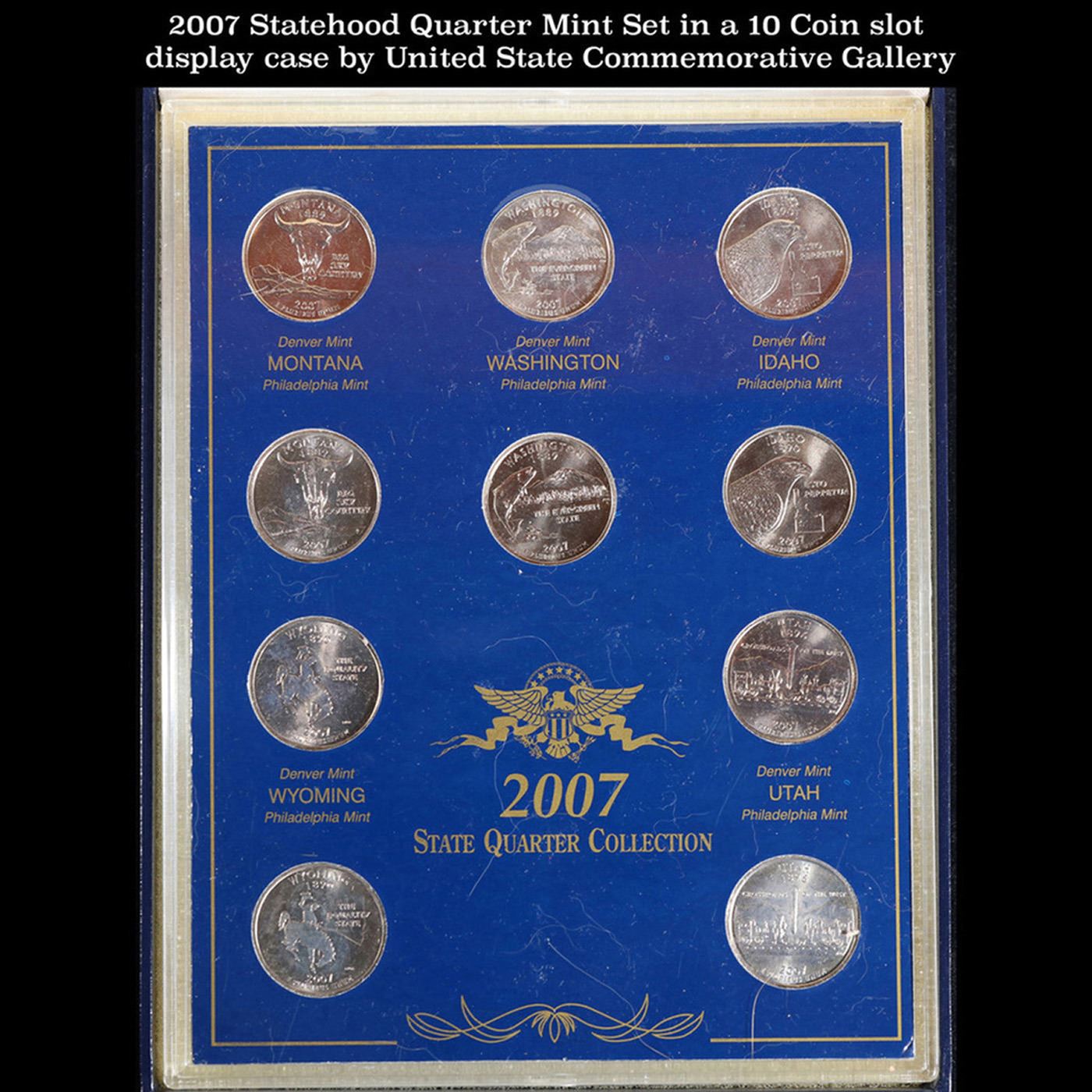 2007 Statehood Quarter Mint Set in a 10 Coin slot display case by United State Commemorative Gallery.. This set contain two of each 2007 Statehood quarters honoring Montana (P,D), Washington (P,D), Idaho (P,D), Wyoming (P,P), Utah (P,P). All 10 America the Beautiful™ State Quarters in a prestigious museum-quality Presidential Display Case by the United State Commemorative Gallery Company, is accented with gold embossing and is perfect for displaying each historic year of the Statehood Quarter Dollar Program.