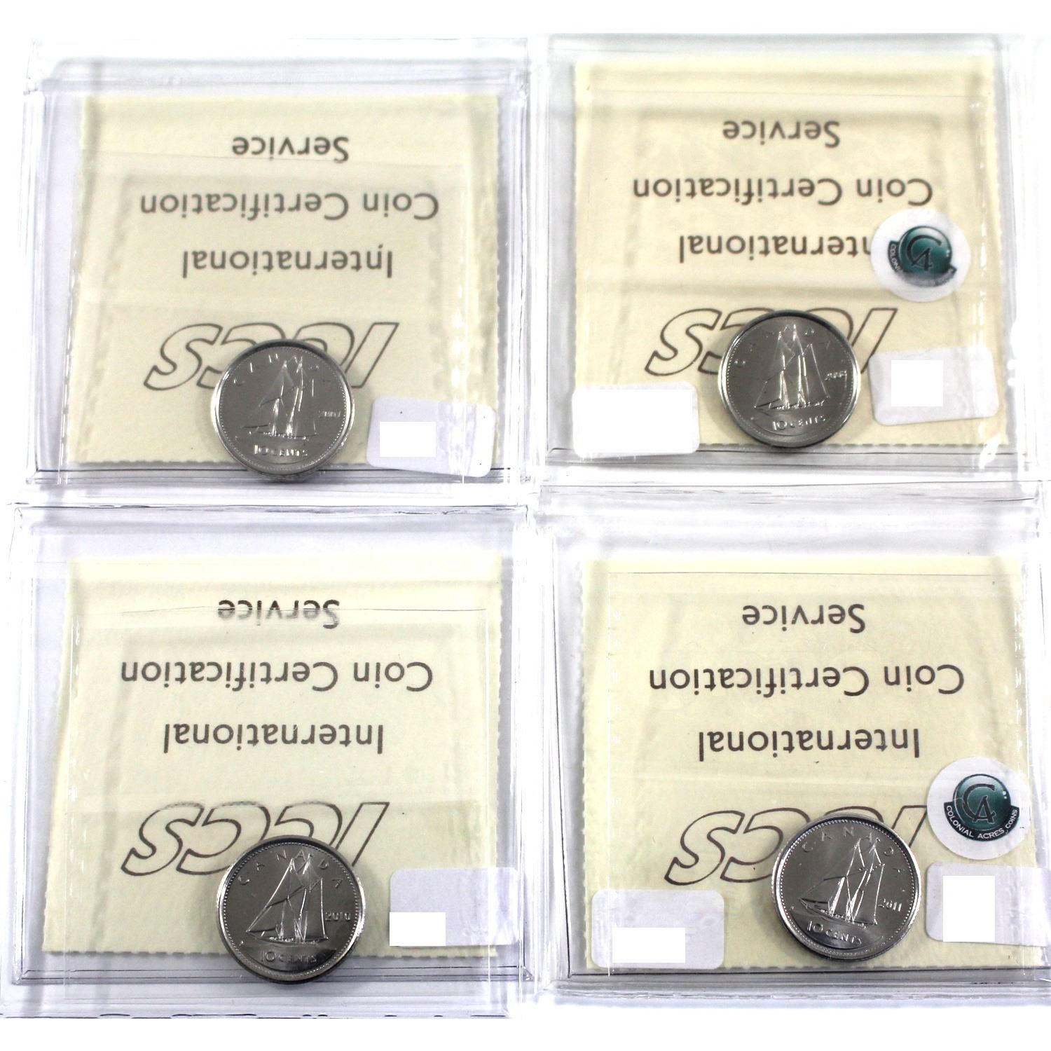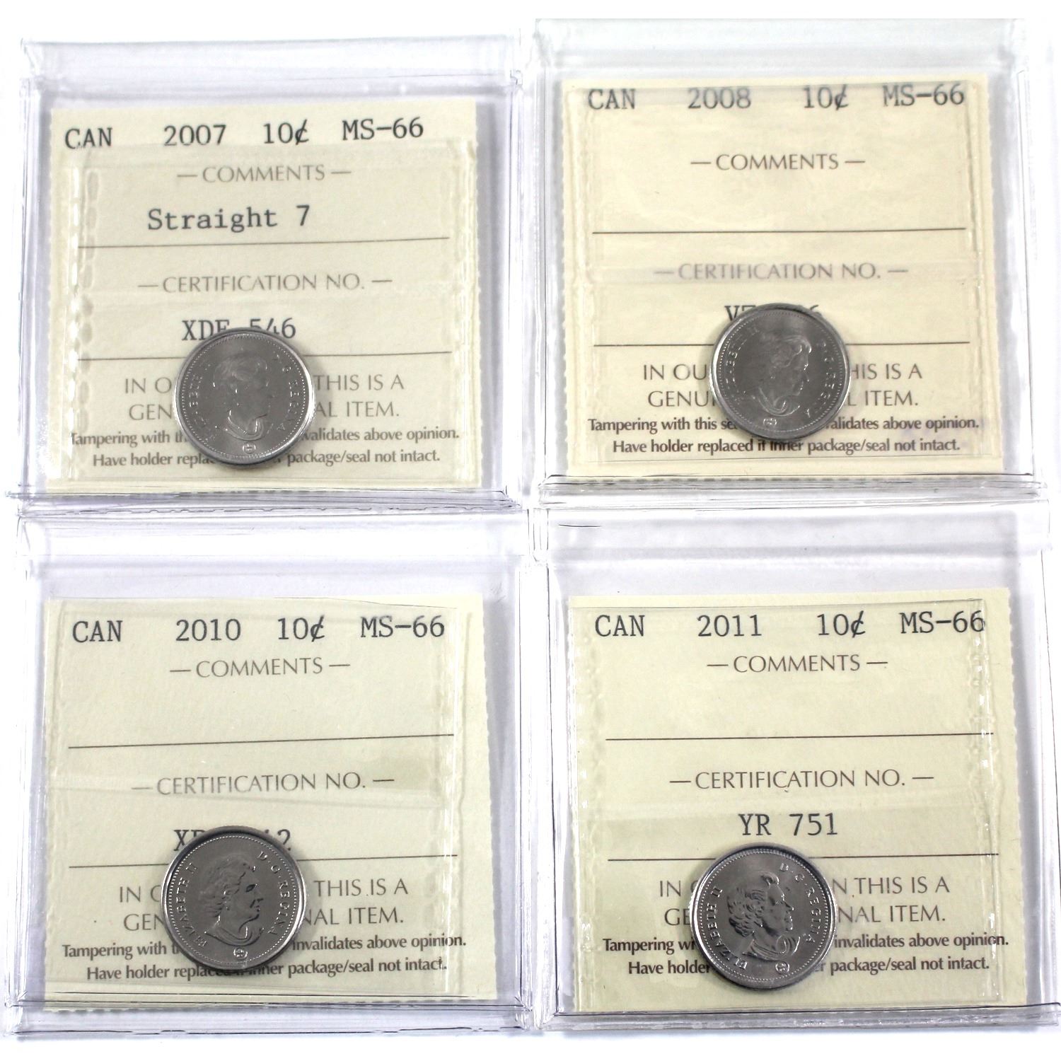 2007 Straight 7, 2008, 2010, 2011 Canada 10-cent ICCS Certified MS-66. 4pcs.