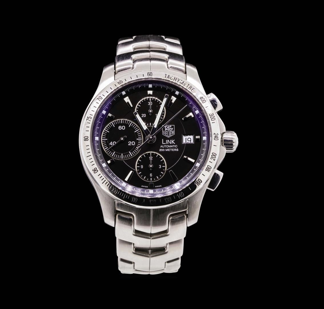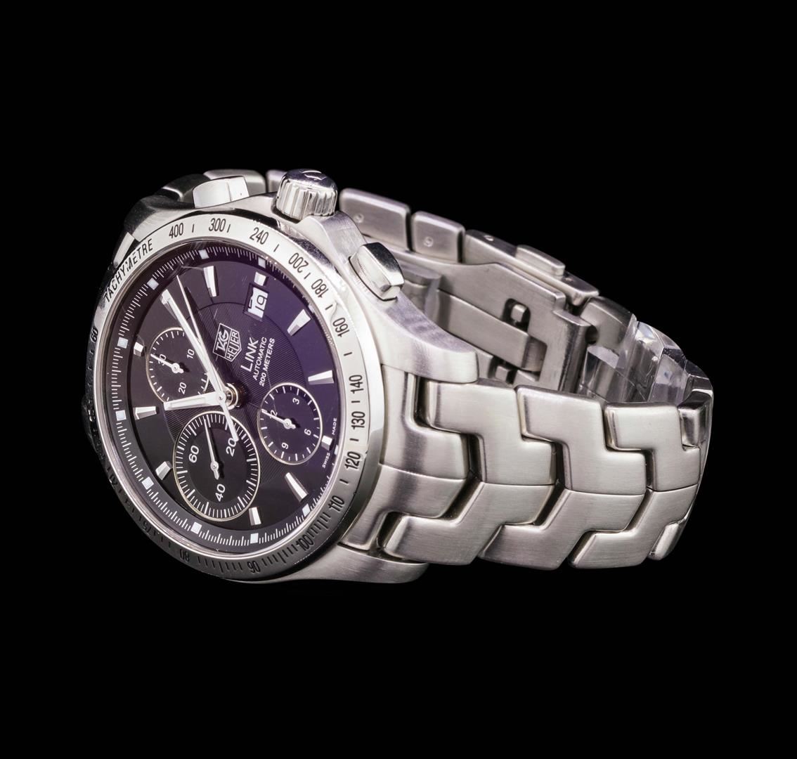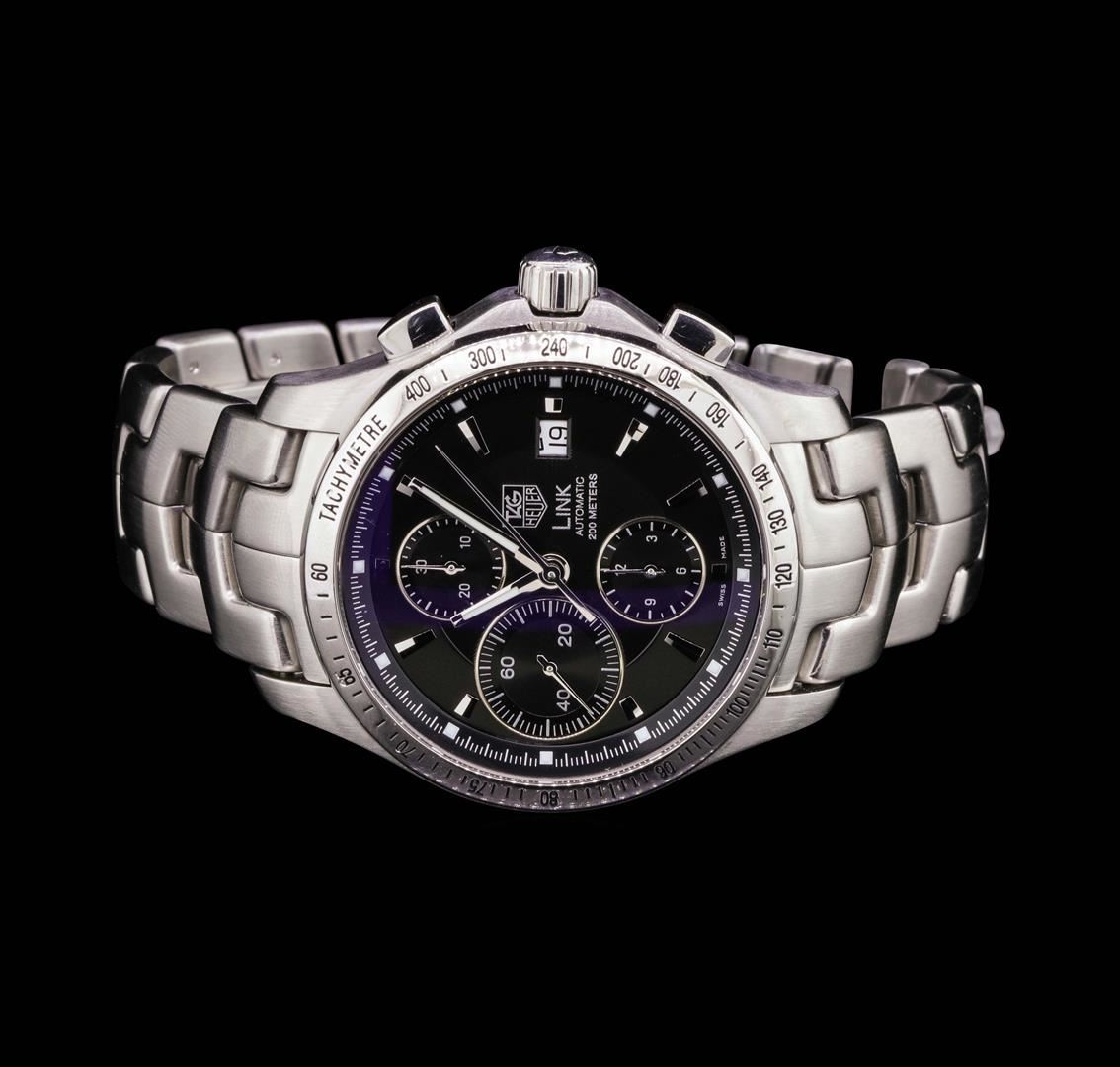 One stainless steel Tag Heuer Link Calibre 16 Chronograph wristwatch. The watch has an automatic winding mechanism with a chronograph, 12-hour counter, tachymeter, small seconds and a thirty-minute counter. The case is stainless steel with a sapphire crystal and caseback and screwed-down crown. The dial is charcoal color with three charcoal subials, luminescent baton type hands and a date window at 3 o'clock. Reference number CJF2110-0, serial number EBY7071.