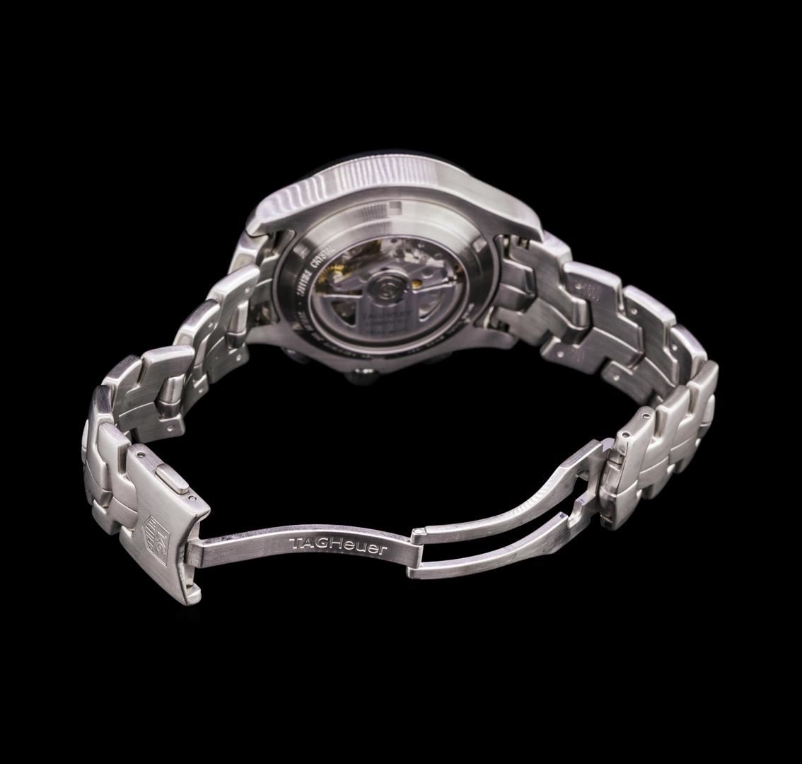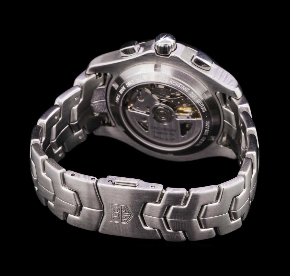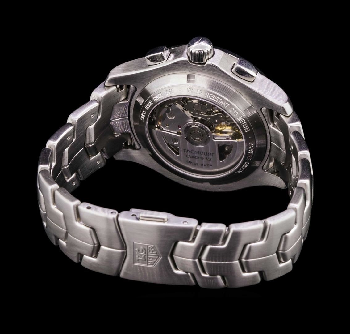 One stainless steel Tag Heuer Link Calibre 16 Chronograph wristwatch. The watch has an automatic winding mechanism with a chronograph, 12-hour counter, tachymeter, small seconds and a thirty-minute counter. The case is stainless steel with a sapphire crystal and caseback and screwed-down crown. The dial is charcoal color with three charcoal subials, luminescent baton type hands and a date window at 3 o'clock. Reference number CJF2110-0, serial number EBY7071.