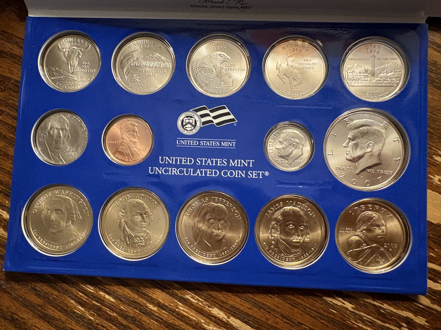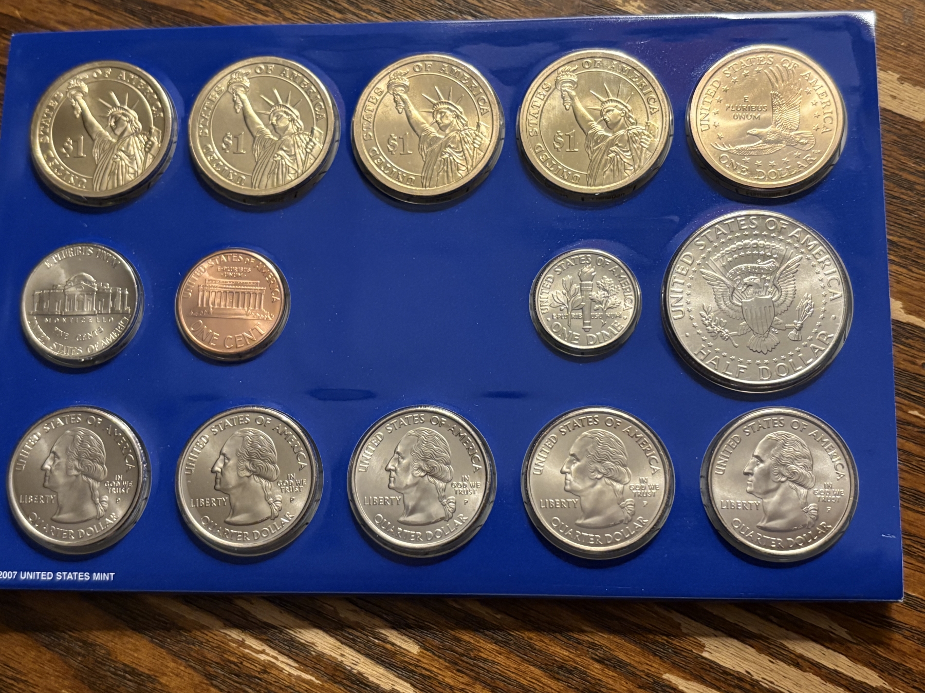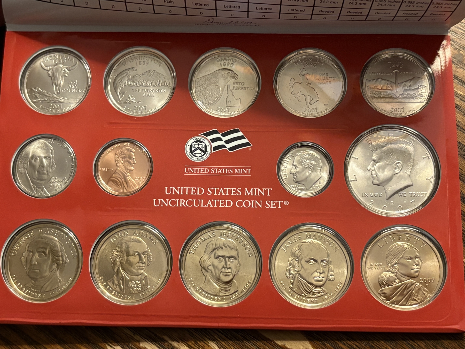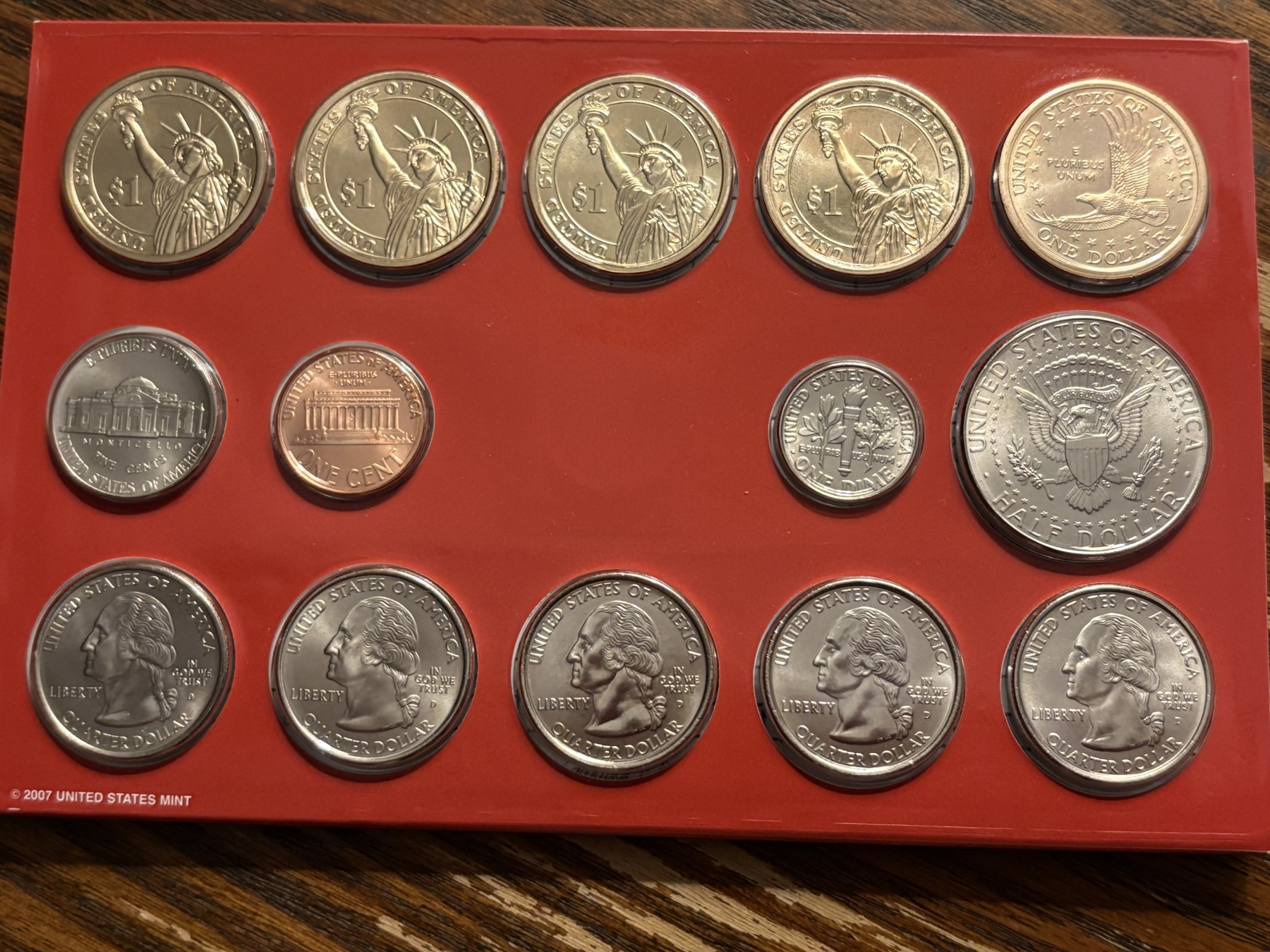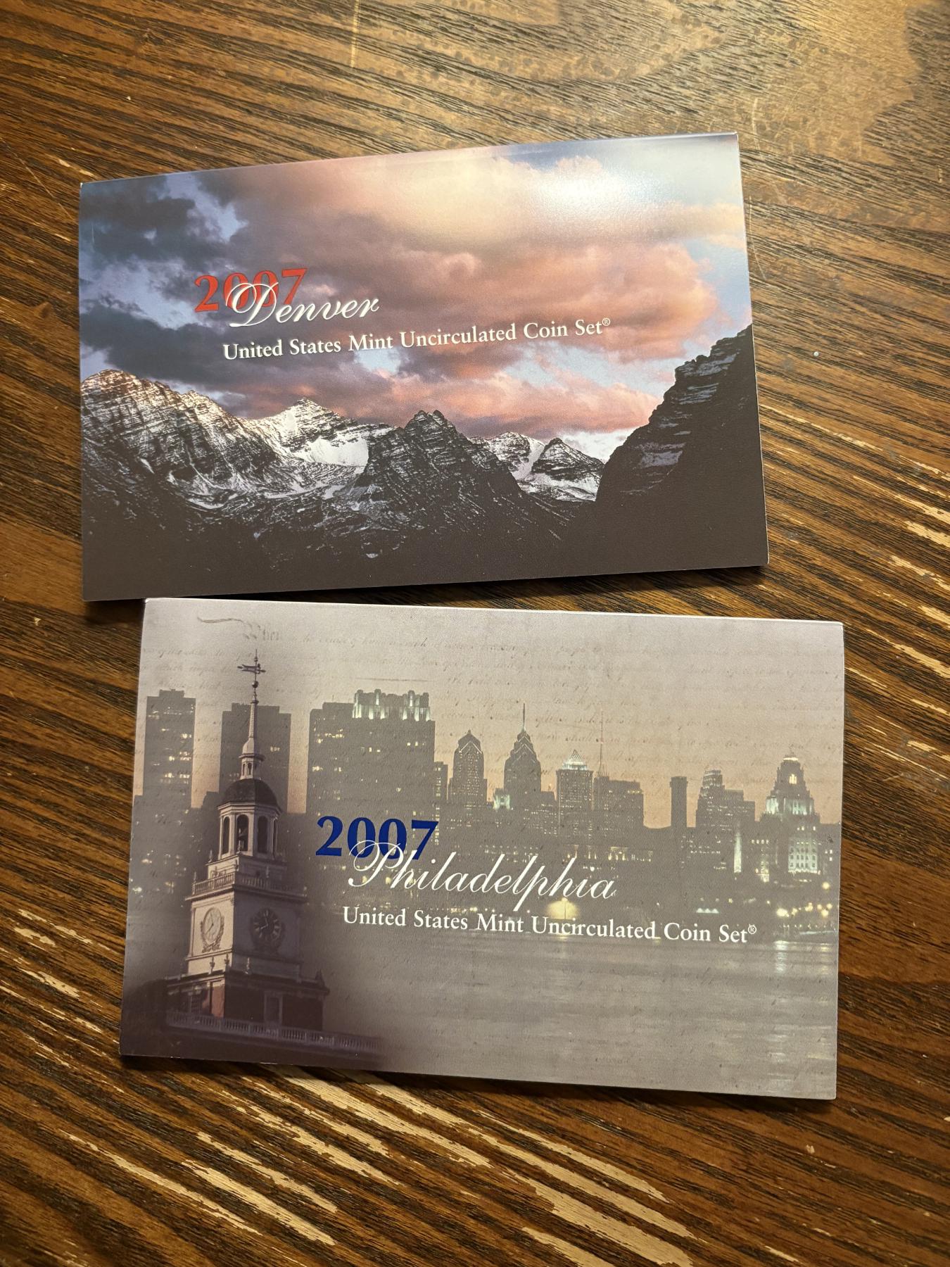 2007 U.S. Mint UNC Coin Sets - Denver & Philadelphia - FV $13.82 - Includes Presidential & Liberty Dollars - Kennedy Half Dollars - Quarters - Dimes - Nickels - Pennies - Certificate of Authenticity