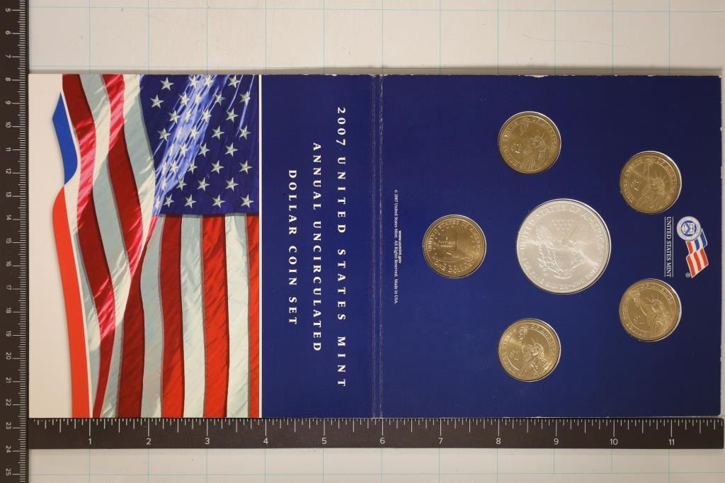 2007-W AMERICAN SILVER EAGLE, 1 SACAGAWEA DOLLAR AND ALL 4-PRESIDENTIAL DOLLARS. IN ORIGINAL US MINT PACKAGING