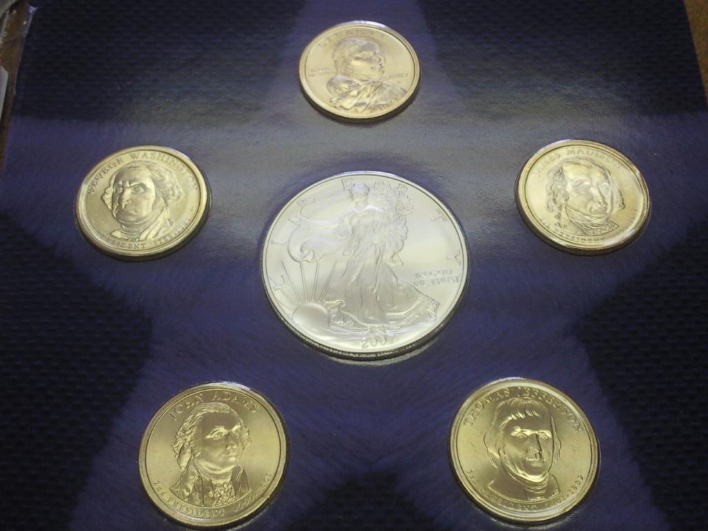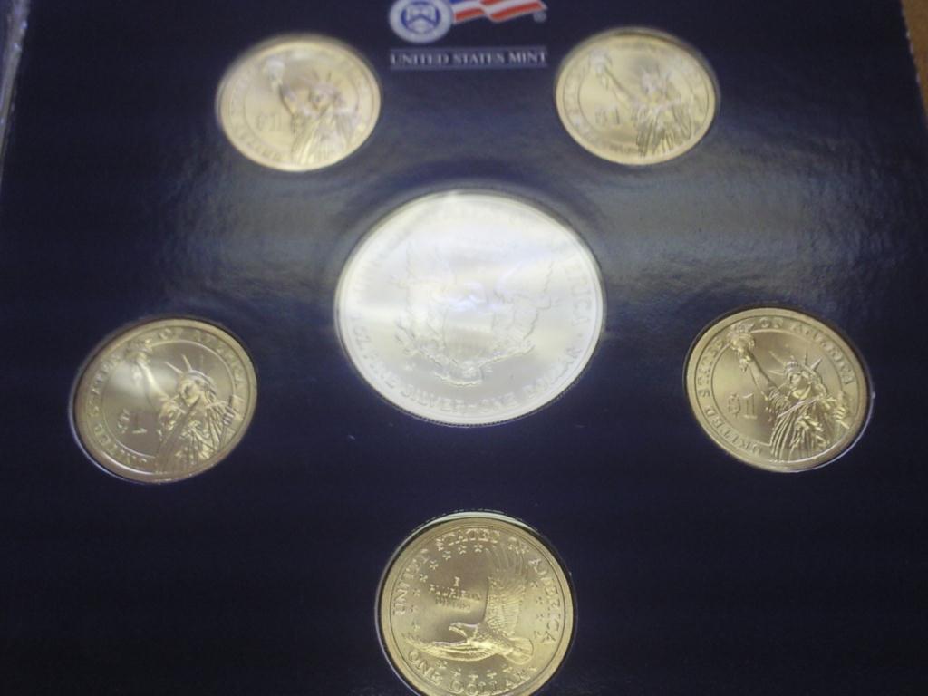 CONTAINS: 2007 AMERICAN SILVER EAGLE, SACAGAWEA DOLLAR AND 4 PRESIDENTIAL DOLLARS