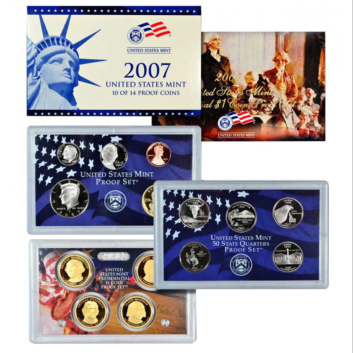 2007 United States Mint Proof Set - 14 Piece set Missing outer box. This set includes One example each of the Lincoln Cent, Jefferson Nickel, Roosevelt Dime, Kennedy Half Dollar, Sacagawea "Golden" Dollar, Montana Quarter, Washington Quarter, Idaho Quarter, Wyoming Quarter, and Utah Quarter (all Copper-Nickel Clad). It also includes the first four Presidential Dollars: Washington, Adams, Jefferson, and Madison (Copper-Nickel Clad).