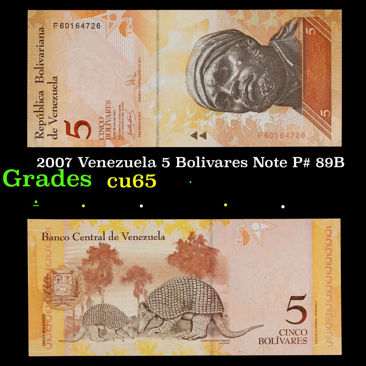 2007 Venezuela 5 Bolivares Note P# 89B Grades Gem CU.