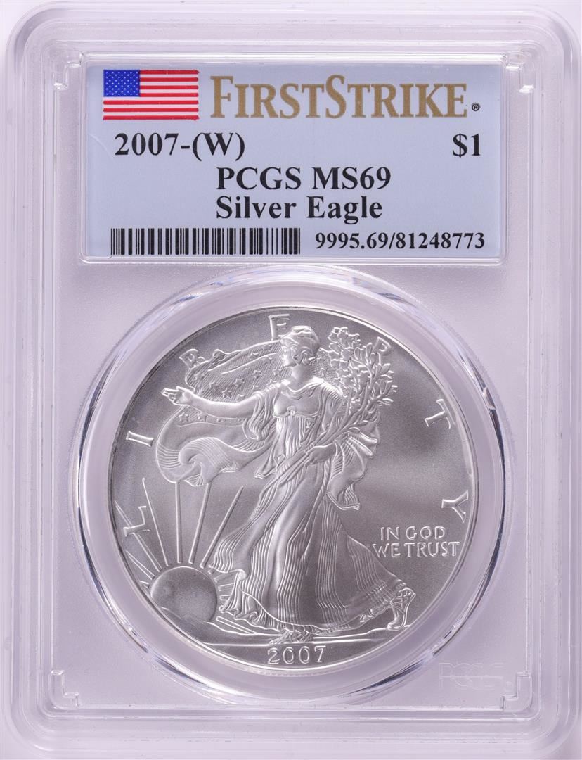 One 2007-(W) $1 American Silver Eagle Coin PCGS MS69 First Strike. PCGS Graded.
