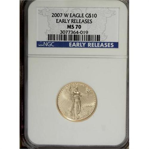<B>2007-W $10 Quarter Ounce Gold Eagle MS70 NGC.</B></I> Early Releases. NGC Census: (0/0). PCGS Population (50/0). (#150429)<BR><BR><b>Shipping:</b> Coins & Currency (<a target="_blank" href="http://www.heritageauctions.com/common/shipping.php">view shipping information</a>)