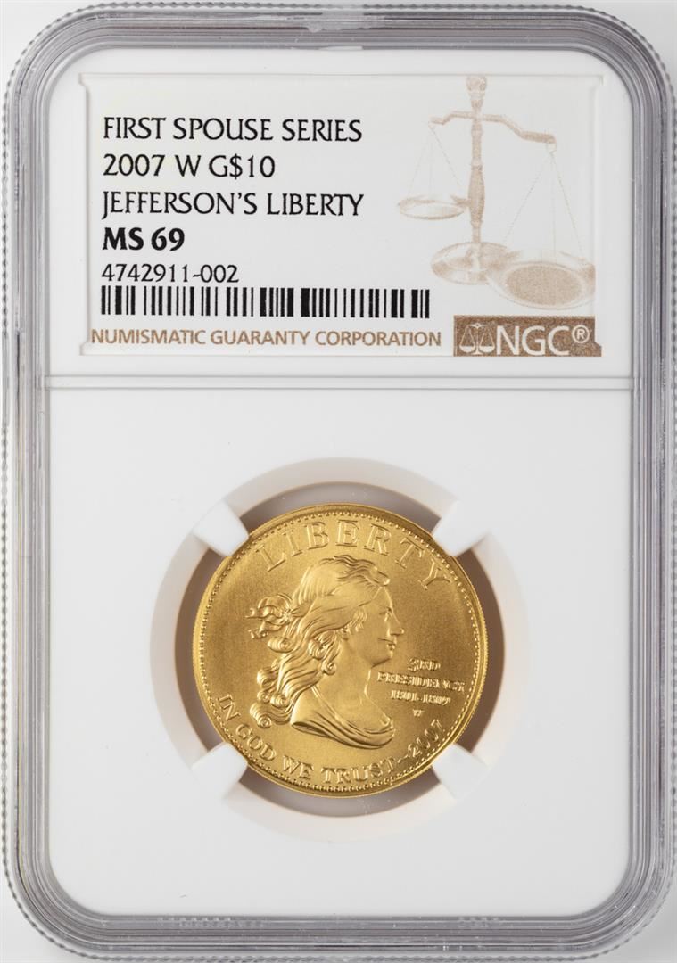 One 2007-W $10 First Spouses Jefferson's Liberty Commemorative Gold Coin NGC MS69. NGC Certified.