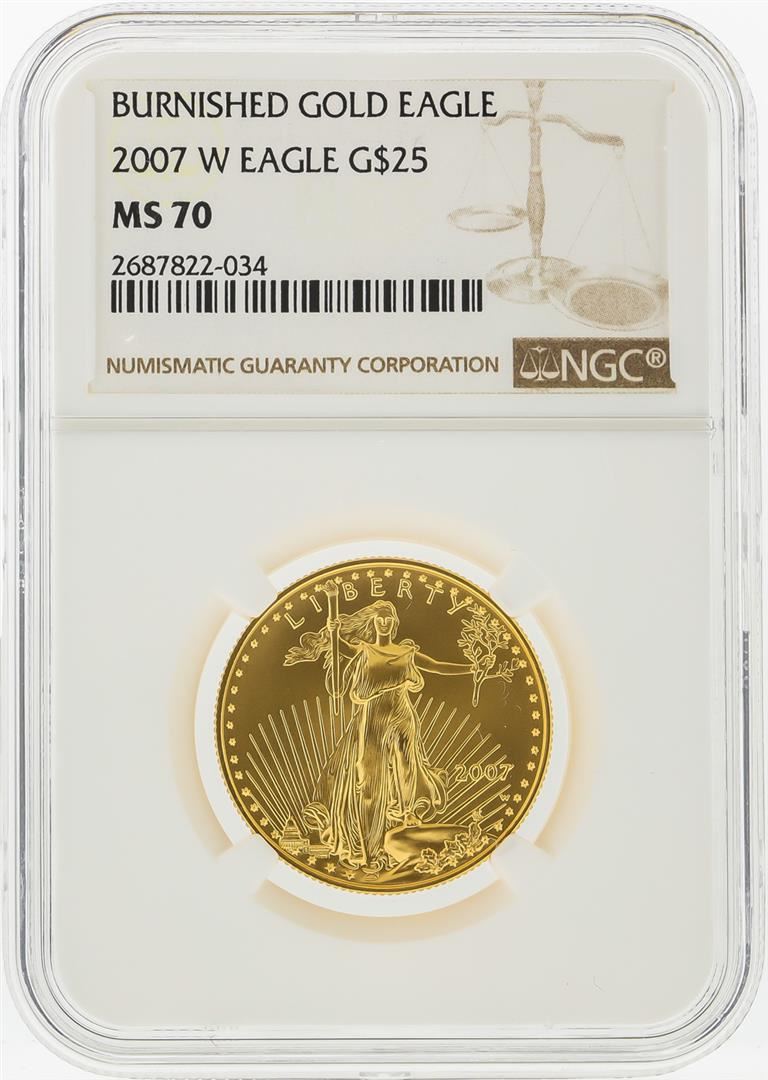 One 2007-W $25 Burnished American Gold Eagle Coin NGC MS70. NGC Certified.