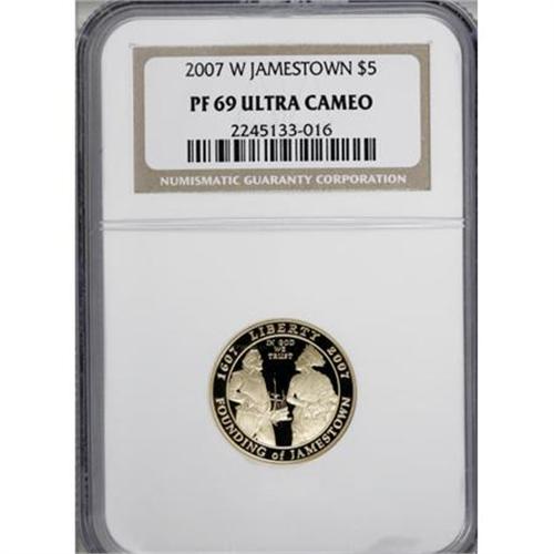 <B>2007-W $5 Jamestown PR69 Deep Cameo NGC.</B></I> NGC Census: (0/0). PCGS Population (959/179). Numismedia Wsl. Price for NGC/PCGS coin in PR69: $255. (#147442)<BR><BR><b>Shipping:</b> Coins & Currency (<a target="_blank" href="http://www.heritageauctions.com/common/shipping.php">view shipping information</a>)
