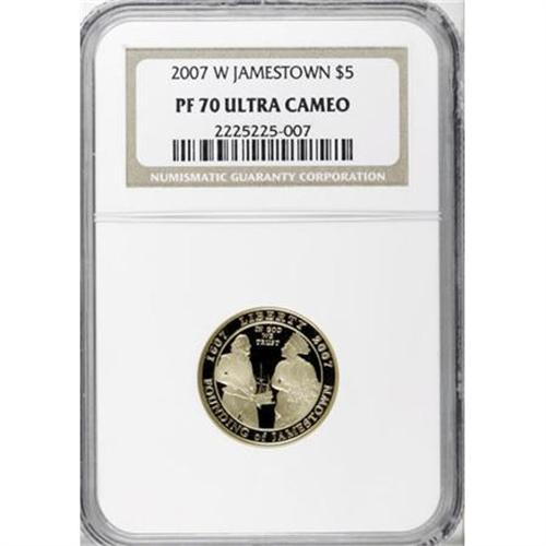 <B>2007-W $5 Jamestown PR70 Deep Cameo NGC.</B></I> NGC Census: (0/0). PCGS Population (186/0). Numismedia Wsl. Price for NGC/PCGS coin in PR70: $320. (#147442)<BR><BR><b>Shipping:</b> Coins & Currency (<a target="_blank" href="http://www.heritageauctions.com/common/shipping.php">view shipping information</a>)